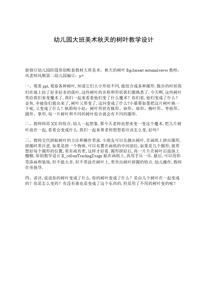 新修订幼儿园阶段原创配套教材大班美术:秋天的树叶Bgclassart:autumnleaves教师:风老师风顺第二幼儿园编订:p>