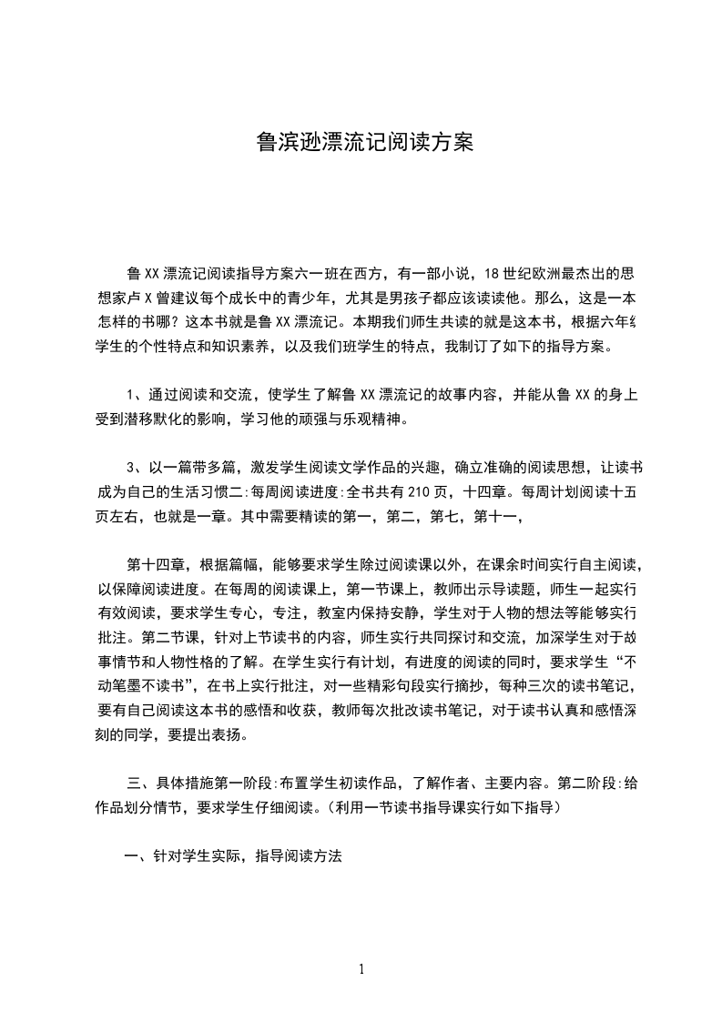 鲁XX漂流记阅读指导方案六一班在西方,有一部小说,18世纪欧洲最杰出的思想家卢X曾建议每个成长中的青少年,尤其是男孩子都应该读读他。那么,这是一本怎样的书哪?这本书就是鲁XX漂流记。本期我们师生共读的就是这本书,根据六年级学生的个性特点和知识素养,以及我们班学生的特点,我制订了如下的指导方案。