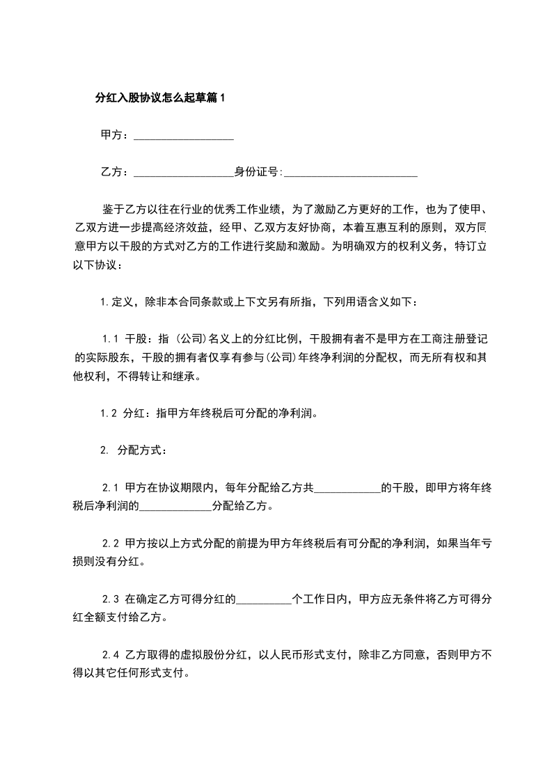 分红入股协议怎么起草篇1