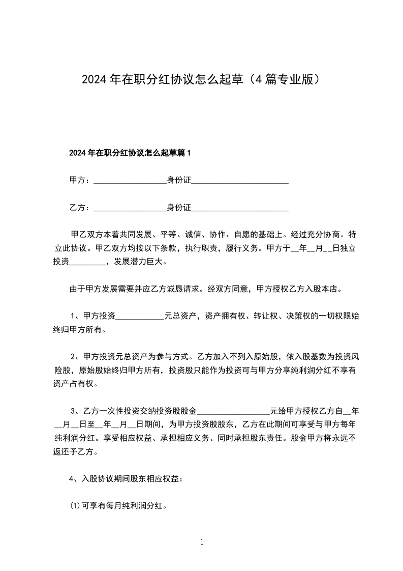 2024年在职分红协议怎么起草篇1