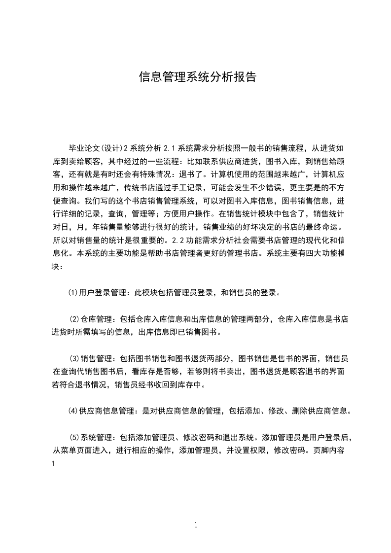 毕业论文(设计)2系统分析2.1系统需求分析按照一般书的销售流程,从进货如库到卖给顾客,其中经过的一些流程:比如联系供应商进货,图书入库,到销售给顾客,还有就是有时还会有特殊情况:退书了。计算机使用的范围越来越广,计算机应用和操作越来越广,传统书店通过手工记录,可能会发生不少错误,更主要是的不方便查询。我们写的这个书店销售管理系统,可以对图书入库信息,图书销售信息,进行详细的记录,查询,管理等;方便用户操作。在销售统计模块中包含了,销售统计,对日,月,年销售量能够进行很好的统计,销售业绩的好坏决定的书店的最终命运。所以对销售量的统计是很重要的。2.2功能需求分析社会需要书店管理的现代化和信息化。本系统的主要功能是帮助书店管理者更好的管理书店。系统主要有四大功能模块: