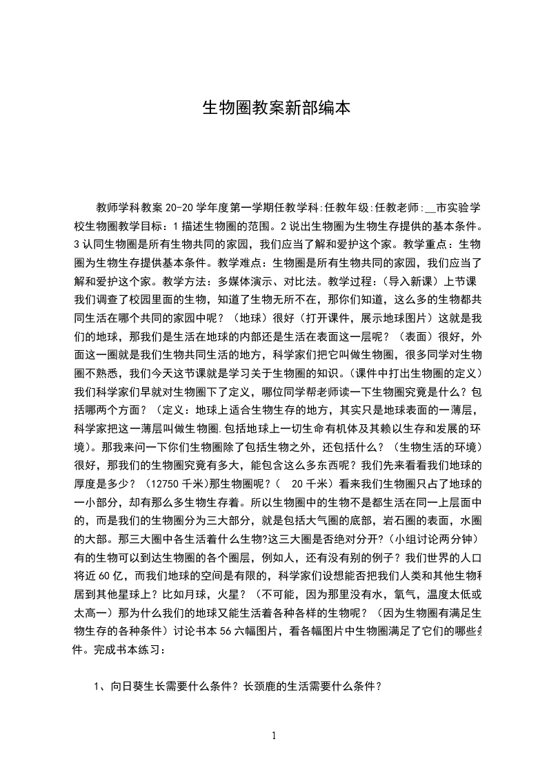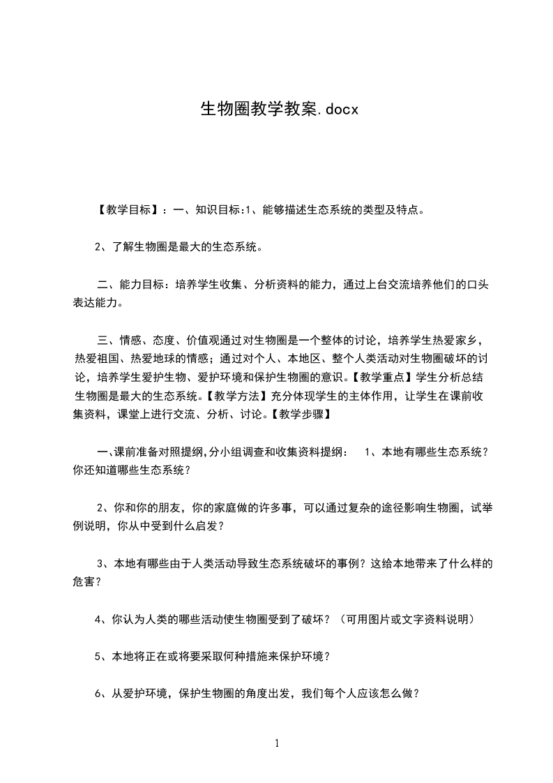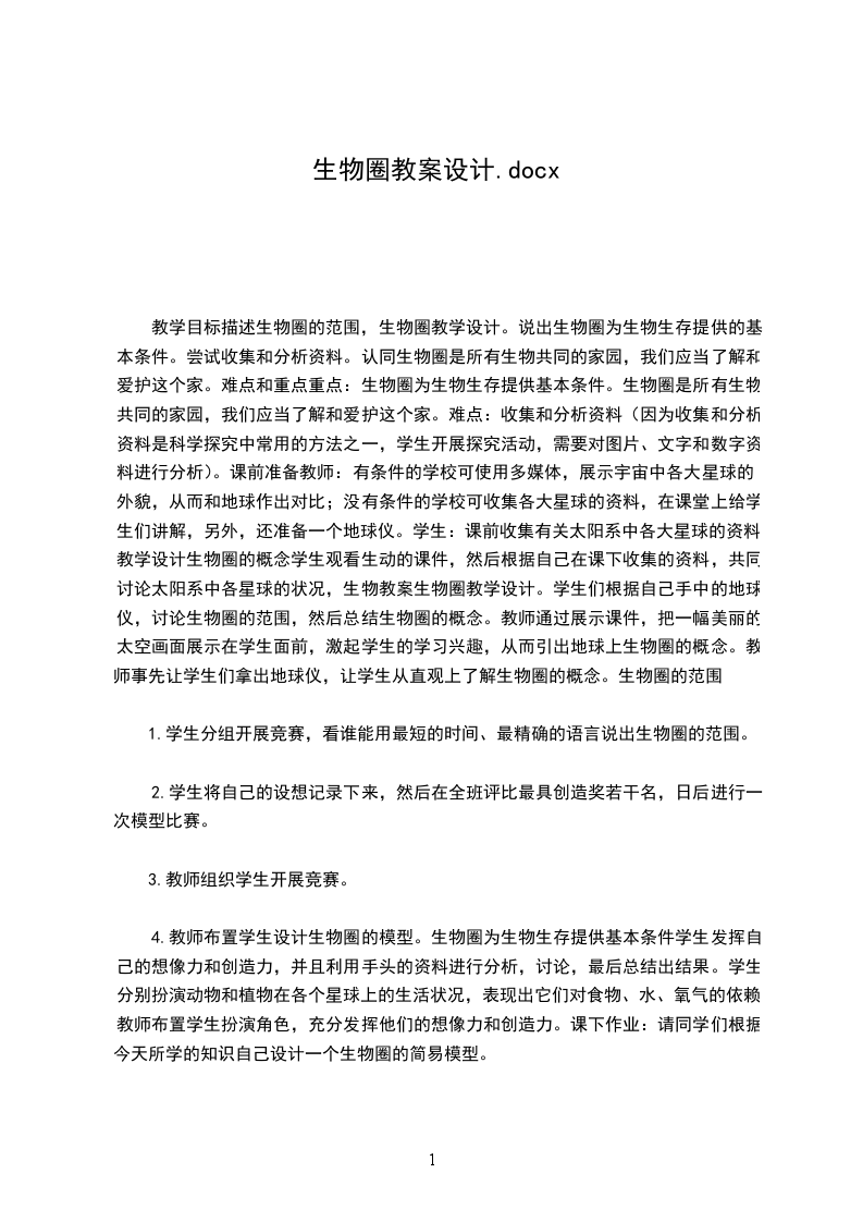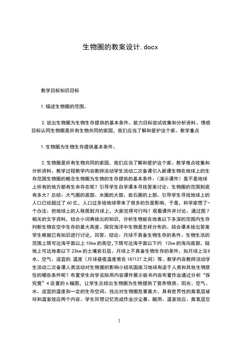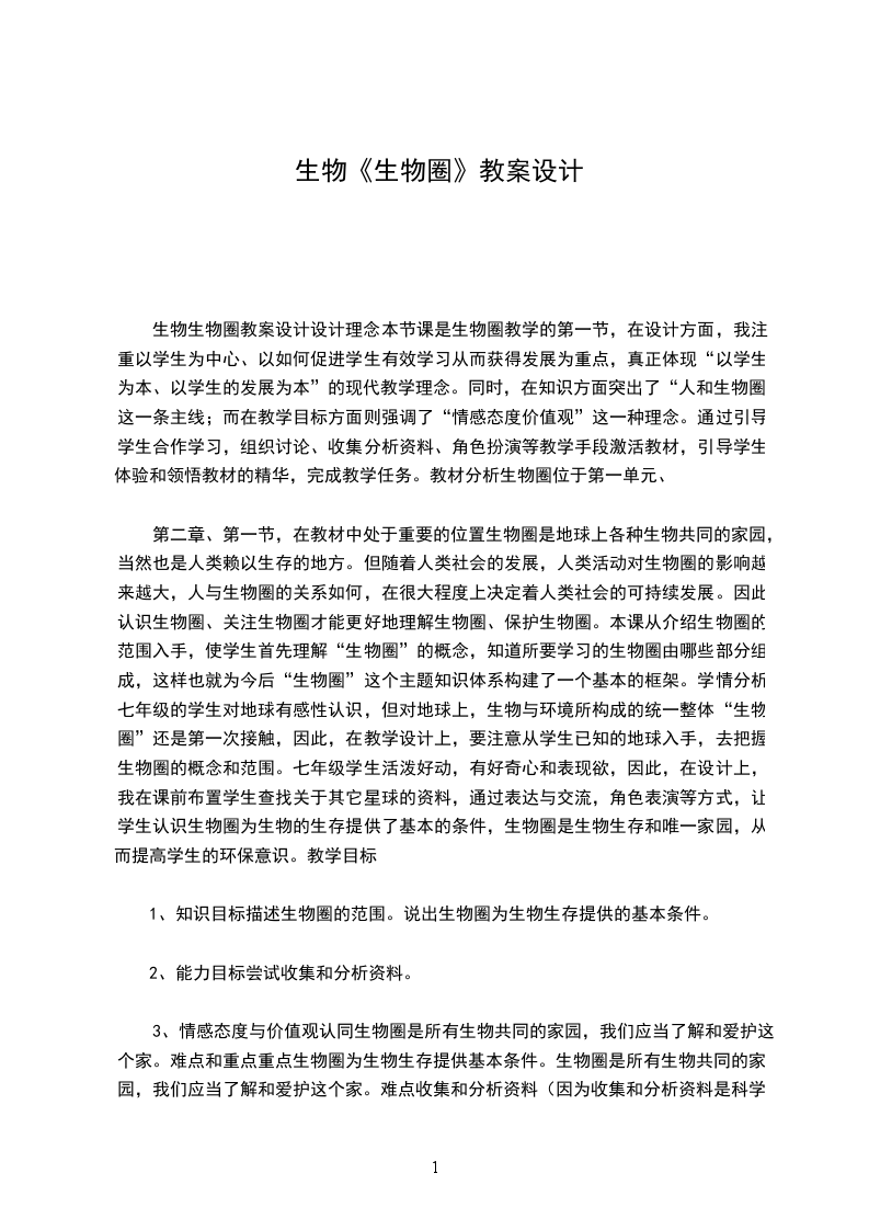 生物生物圈教案设计设计理念本节课是生物圈教学的第一节,在设计方面,我注重以学生为中心、以如何促进学生有效学习从而获得发展为重点,真正体现“以学生为本、以学生的发展为本”的现代教学理念。同时,在知识方面突出了“人和生物圈”这一条主线;而在教学目标方面则强调了“情感态度价值观”这一种理念。通过引导学生合作学习,组织讨论、收集分析资料、角色扮演等教学手段激活教材,引导学生体验和领悟教材的精华,完成教学任务。教材分析生物圈位于第一单元、