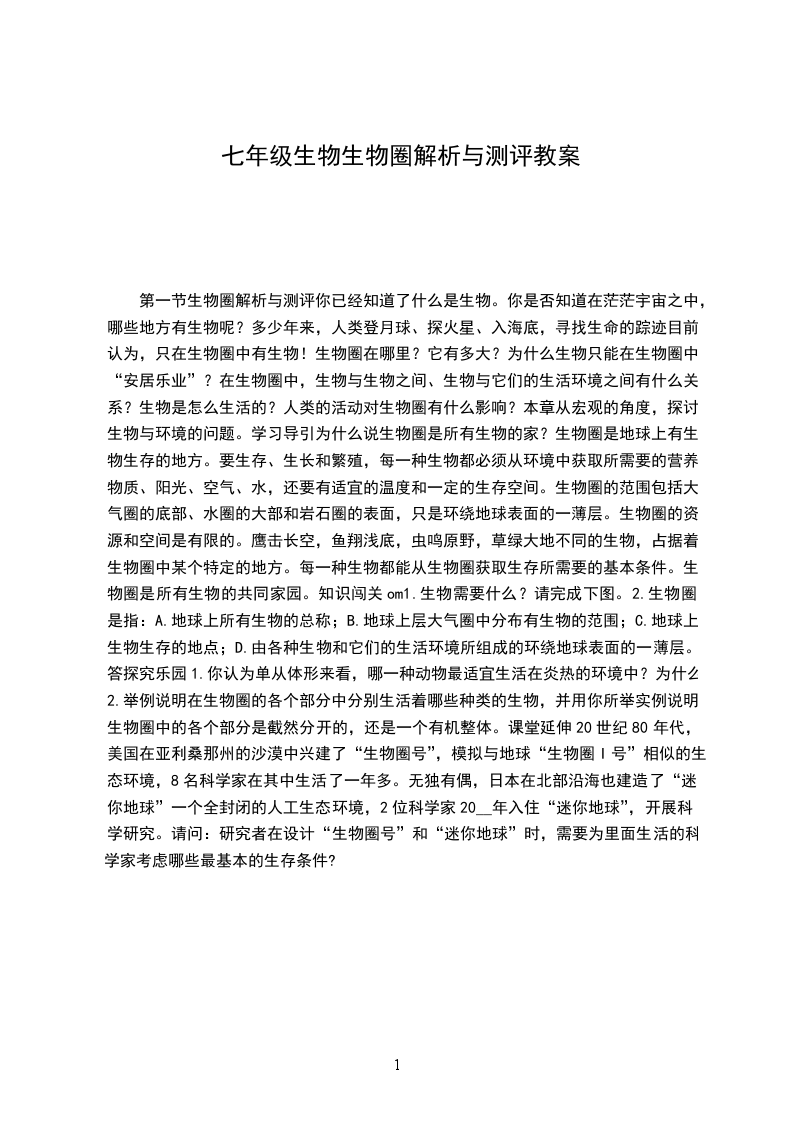 3、情感态度与价值观认同生物圈是所有生物共同的家园,我们应当了解和爱护这个家。难点和重点重点生物圈为生物生存提供基本条件。生物圈是所有生物共同的家园,我们应当了解和爱护这个家。难点收集和分析资料(因为收集和分析资料是科学探究中常用的方法之一,学生开展探究活动,需要对图片、文字和数字资料进行分析)。课前准备教师制作多媒体课件,展示宇宙中各大星球的外貌,从而和地球作出对比。学生课前收集有关太阳系中各大星球的资料。教学方法多媒体演示,合作学习、角色扮演课时安排1课时教学过程内容学生活动教师活动生物圈的范围学生阅读教材,并讨论生物圈的范围教师组织学生阅读,引导学生归纳与总结生物圈为生物生存提供基本条件学生发挥自己的想像力和创造力,并且利用手头的资料进行分析,讨论,最后总结出结果。学生展示收集的其它星球不适于生物生存的条件学生分别扮演动物和植物在各个星球上的生活状况,表现出它们对食物、水、氧气的依赖。