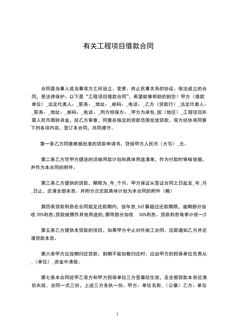 合同是当事人或当事双方之间设立、变更、终止民事关系的协议。依法成立的合同,受法律保护。以下是“工程项目借款合同”,希望能够帮助的到您!甲方(借款单位)_法定代表人:_职务:_地址:_邮码:_电话:_乙方(贷款行)_法定代表人:_职务:_地址:_邮码:_电话:_丙方担保方:_甲方为承包_国(地区)_工程项目所需人民币周转资金,经乙方审查,同意在核定的贷款范围发放贷款。双方经协商同意下列各项内容,签订本合同,共同遵守。