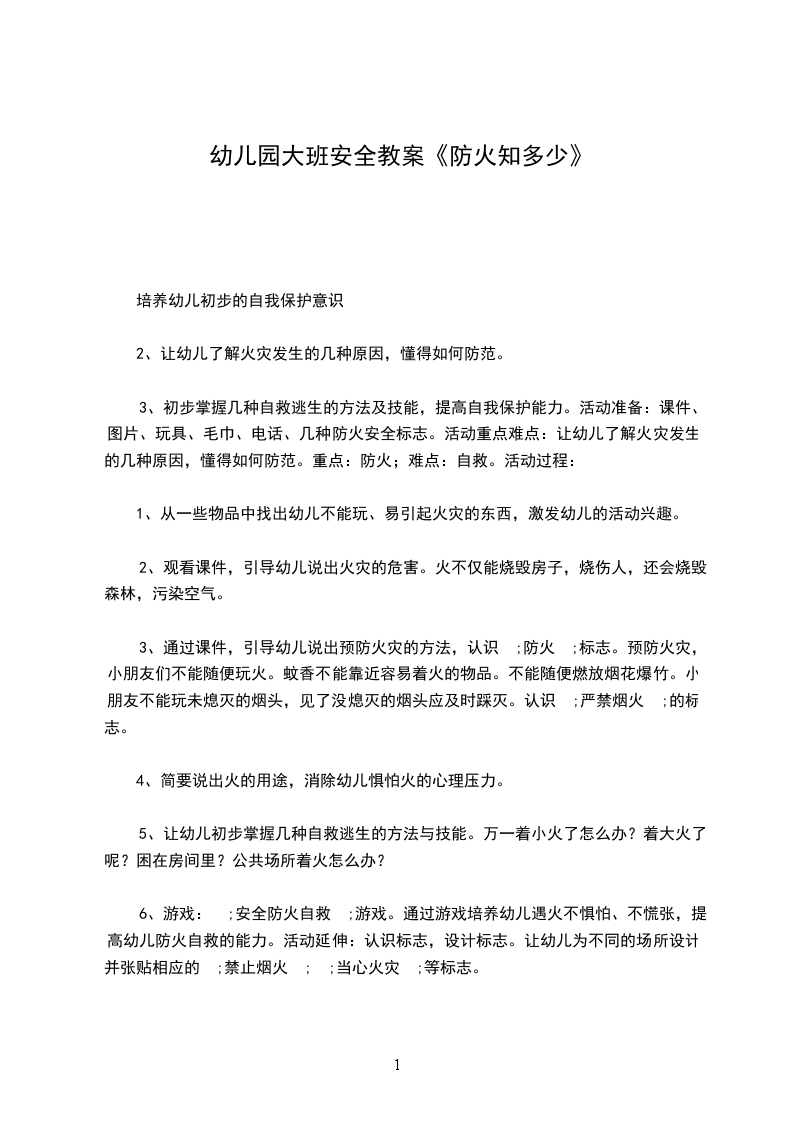 3、初步掌握几种自救逃生的方法及技能,提高自我保护能力。活动准备:课件、图片、玩具、毛巾、电话、几种防火安全标志。活动重点难点:让幼儿了解火灾发生的几种原因,懂得如何防范。重点:防火;难点:自救。活动过程: