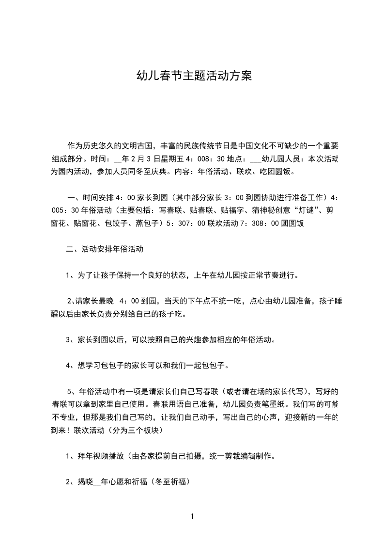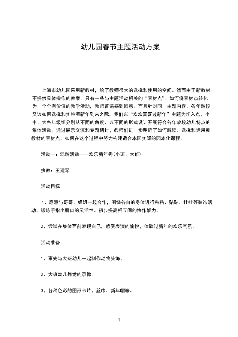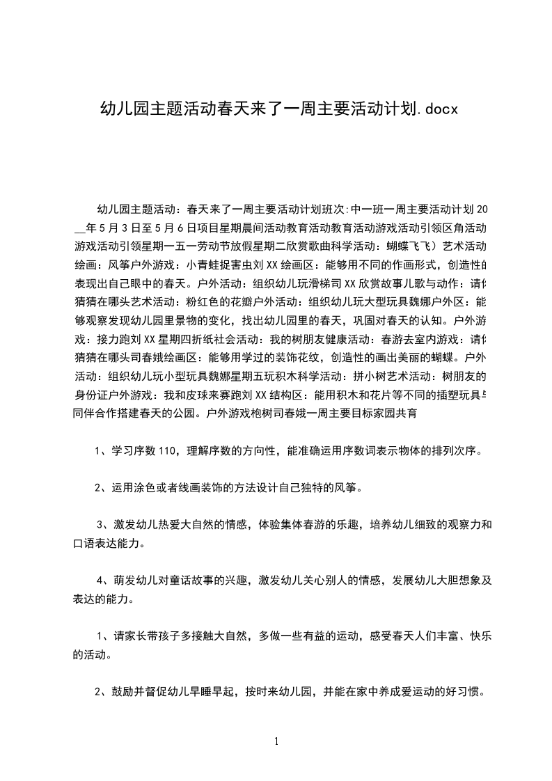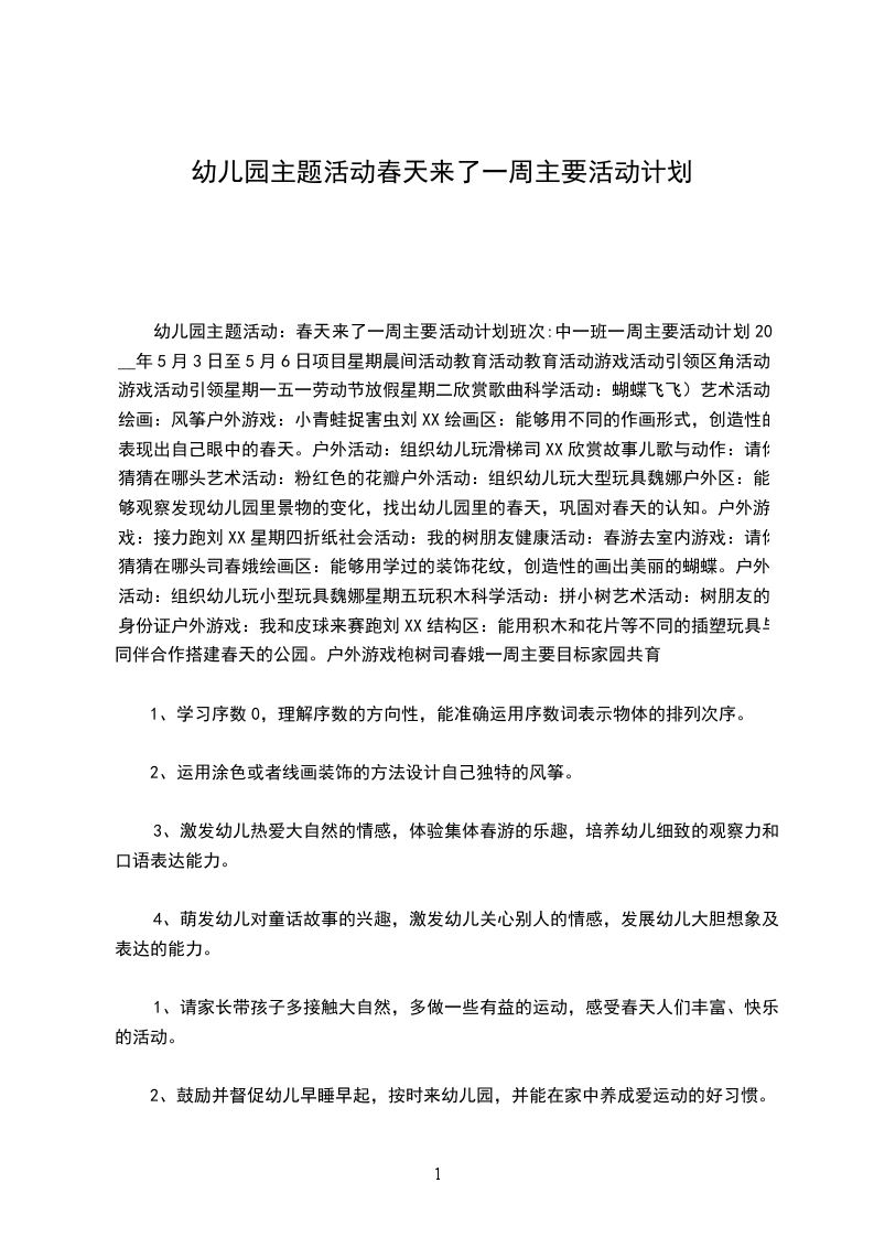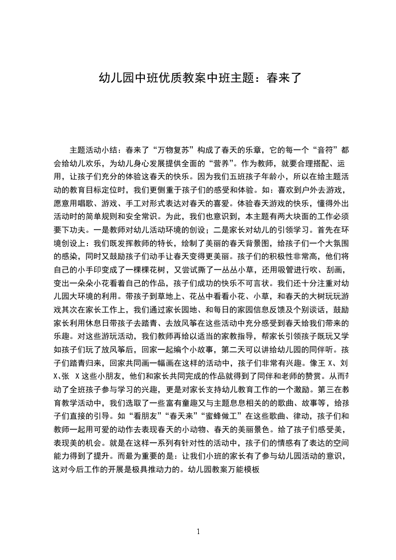 主题活动小结:春来了“万物复苏”构成了春天的乐章,它的每一个“音符”都会给幼儿欢乐,为幼儿身心发展提供全面的“营养”。作为教师,就要合理搭配、运用,让孩子们充分的体验这春天的快乐。因为我们五班孩子年龄小,所以在给主题活动的教育目标定位时,我们更侧重于孩子们的感受和体验。如:喜欢到户外去游戏,愿意用唱歌、游戏、手工对形式表达对春天的喜爱。体验春天游戏的快乐,懂得外出活动时的简单规则和安全常识。为此,我们也意识到,本主题有两大块面的工作必须要下功夫。一是教师对幼儿活动环境的创设;二是家长对幼儿的引领学习。首先在环境创设上:我们既发挥教师的特长,绘制了美丽的春天背景图,给孩子们一个大氛围的感染,同时又鼓励孩子们动手让春天变得更美丽。孩子们的积极性非常高,他们将自己的小手印变成了一棵棵花树,又尝试撕了一丛丛小草,还用吸管进行吹、刮画,变出一朵朵小花看着自己的作品,孩子们成功的快乐不可言状。我们还十分注重对幼儿园大环境的利用。带孩子到草地上、花丛中看看小花、小草,和春天的大树玩玩游戏其次在家长工作上,我们通过家长园地、和每日的家园信息反馈及个别谈话,鼓励家长利用休息日带孩子去踏青、去放风筝在这些活动中充分感受到春天给我们带来的乐趣。对这些游玩活动,我们教师再给以适当的家教指导,帮家长引领孩子既玩又学:如孩子们玩了放风筝后,回家一起编个小故事,第二天可以讲给幼儿园的同伴听。孩子们踏青归来,回家共同画一幅画在这样的活动中,孩子们非常有兴趣。像王X、刘X、张X这些小朋友,他们和家长共同完成的作品就得到了同伴和老师的赞赏。从而带动了全班孩子参与学习的兴趣,更是对家长支持幼儿教育工作的一个激励。第三在教育教学活动中,我们选取了一些富有童趣又与主题息息相关的的歌曲、故事等,给孩子们直接的引导。如“看朋友”“春天来”“蜜蜂做工”在这些歌曲、律动,孩子们和教师一起用可爱的动作去表现春天的小动物、春天的美丽景色。给了孩子们感受美,表现美的机会。就是在这样一系列有针对性的活动中,孩子们的情感有了表达的空间、能力得到了提升。而最为重要的是:让我们小班的家长有了参与幼儿园活动的意识,这对今后工作的开展是极具推动力的。幼儿园教案万能模板