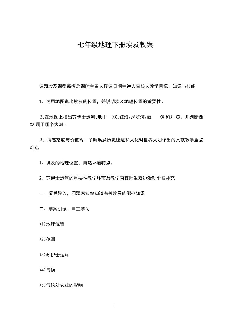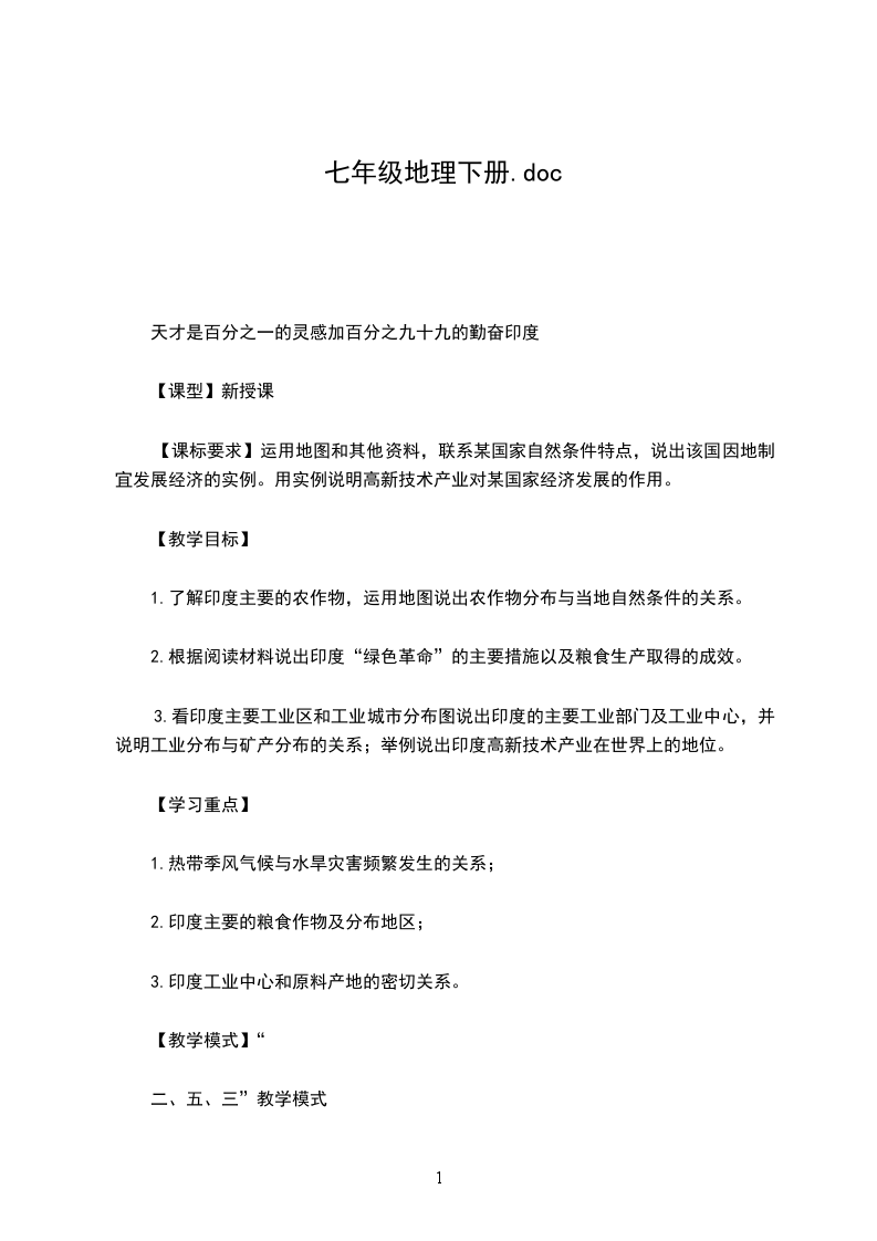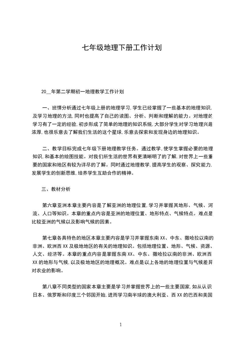 二、教学目标完成七年级下册地理教学任务。通过教学,使学生掌握必要的地理知识,和基本的绘图技能。对我们所生活的世界有更清晰明了的了解,对世界上一些重要的国家和地区有较为详尽的了解。同时通过地理教学,提高学生的观察、探究能力,发展学生的创新思维,培养学生互助合作的精神。