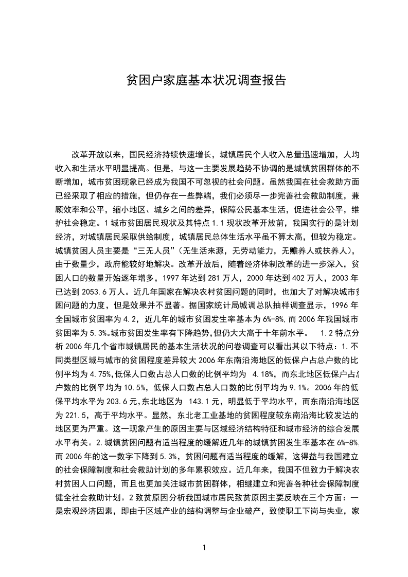 改革开放以来,国民经济持续快速增长,城镇居民个人收入总量迅速增加,人均收入和生活水平明显提高。但是,与这一主要发展趋势不协调的是城镇贫困群体的不断增加,城市贫困现象已经成为我国不可忽视的社会问题。虽然我国在社会救助方面已经采取了相应的措施,但仍存在一些弊端,我们必须尽一步完善社会救助制度,兼顾效率和公平,缩小地区、城乡之间的差异,保障公民基本生活,促进社会公平,维护社会稳定。1城市贫困居民现状及其特点1.1现状改革开放前,我国实行的是计划经济,对城镇居民采取供给制度,城镇居民总体生活水平虽不算太高,但较为稳定。城镇贫困人员主要是“三无人员”(无生活来源,无劳动能力,无赡养人或扶养人),由于数量少,政府能较好地解决。改革开放后,随着经济体制改革的进一步深入,贫困人口的数量开始逐年增多,1997年达到281万人,2000年达到402万人,2003年已达到2053.6万人。近几年国家在解决农村贫困问题的同时,也加大了对解决城市贫困问题的力度,但是效果并不显著。据国家统计局城调总队抽样调查显示,1996年全国城市贫困率为4.2,近几年的城市贫困发生率基本为6%-8%,而2006年我国城市贫困率为5.3%。城市贫困发生率有下降趋势,但仍大大高于十年前水平。1.2特点分析2006年几个省市城镇居民的基本生活状况的问卷调查可以看出其以下特点:1.不同类型区域与城市的贫困程度差异较大2006年东南沿海地区的低保户占总户数的比例平均为4.75%,低保人口数占总人口数的比例平均为4.18%,而东北地区低保户占总户数的比例平均为10.5%,低保人口数占总人口数的比例平均为9.1%。2006年的低保平均水平为203.6元,东北地区为143.1元,明显低于平均水平,而东南沿海地区为221.5,高于平均水平。显然,东北老工业基地的贫困程度较东南沿海比较发达的地区更为严重。这一现象产生的原因主要与区域经济结构特征和城市经济的综合发展水平有关。2.城镇贫困问题有适当程度的缓解近几年的城镇贫困发生率基本在6%-8%,而2006年的这一数字下降到5.3%,贫困问题有适当程度的缓解,这得益与我国建立的社会保障制度和社会救助计划的多年累积效应。近几年来,我国不但致力于解决农村贫困人口问题,而且也更加关注城市贫困群体,相继建立和完善各种社会保障制度,健全社会救助计划。2致贫原因分析我国城市居民致贫原因主要反映在三个方面:一是宏观经济因素,即由于区域产业的结构调整与企业破产,致使职工下岗与失业,家庭实际收入减少;二是个人因素,如个人健康问题、素质问题、择业观念等原因,导致不能从事或只能从事低收入工作;三是家庭因素,如赡养系数大或其他负担过重等等。本调查问卷设计了五个具体原因和一项其他原因。从调查结果看,首要原因是无固定职业;其次是下岗;并列第三的是子女上学和其他;第五是意外事故;第六是天灾。其中,无固定职业的比例最大,为40%,所占比例将近一半。其次是下岗,所占比例为16%。这一现象的产生与我国这些年来的城市经济体制改革、经济结构调整和企业转换经营机制是分不开的。一些受旧体制束缚的行业和企业,人浮于事,冗员膨胀,工作效率低,经济效益差,无法适应市场经济竞争的需要,企业陷入极大的困境。国家实行经济体制改革(尤其是国有企业改革),使下岗、失业人员大量增加,造成其收入下降,陷入经济困难。这一宏观经济因素已经成为当前城镇致贫的主要因素,应当予以重视。根据调查结果,子女上学已成为城市居民贫困第三大原因。随着我国国民经济的增长和物价指数的提高,教育费用也水涨船高,在居民消费开支中,教育开支占有很大的比例,这对本来生活上就难以维继的贫困居民来造成很大的压力,对子女教育费用的支出可能导致其更加贫困。调查结果显示,其他致贫原因主要来自贫困居民家庭因素,如子女患病、主要劳动者身体状况差失去劳动能力、家庭突遭变故等。3政策建议对于低保户最须解决的问题,本次调查列出了六个项目,即“提高最低保障水平”、“建立医疗保险机制”、“建立助学机制”、“给介绍一份合适的工作”和“建立养老机制”。根据调查结果,列为解决的问题首位的是工作问题,其次是提高最低生活保障,接下来依次是建立医疗保险机制、助学机制和建立养老机制。我国现阶段主要通过社会救助制度解决城市贫困问题。其主要是由政府牵头,通过法律保障,建立社会救助制度。我国针对城市贫困的社会救助制度主要包括最低生活保障制度、医疗救助制度、教育救助制度、住房救助制度、灾害救助制度。其中,最低生活保障制度是城市救助制度的核心,在解决当前贫困问题方面起到了重要作用,解决了我国大量下岗失业人员基本生活问题。正如调查结果所示,最低生活保障水平是城镇居民所关注的焦点之一,所以我们应该充分发挥低保制度的优越性借以解决当前城镇贫困问题。但是这项制度在实践中存在一些问题,必须加以重视,如:低保制度覆盖范围过窄、低保制度的管理问题、低保标准不够合理、低保制度的公平与效率问题等。值得注意的是,根据调查结果,虽然要求提高最低保障水平的人占了相当大的比重,但是有更多的人希望得到一份合适的工作。政府应该积极实施再就业工程,多方面扩大就业渠道。具体建议如下: