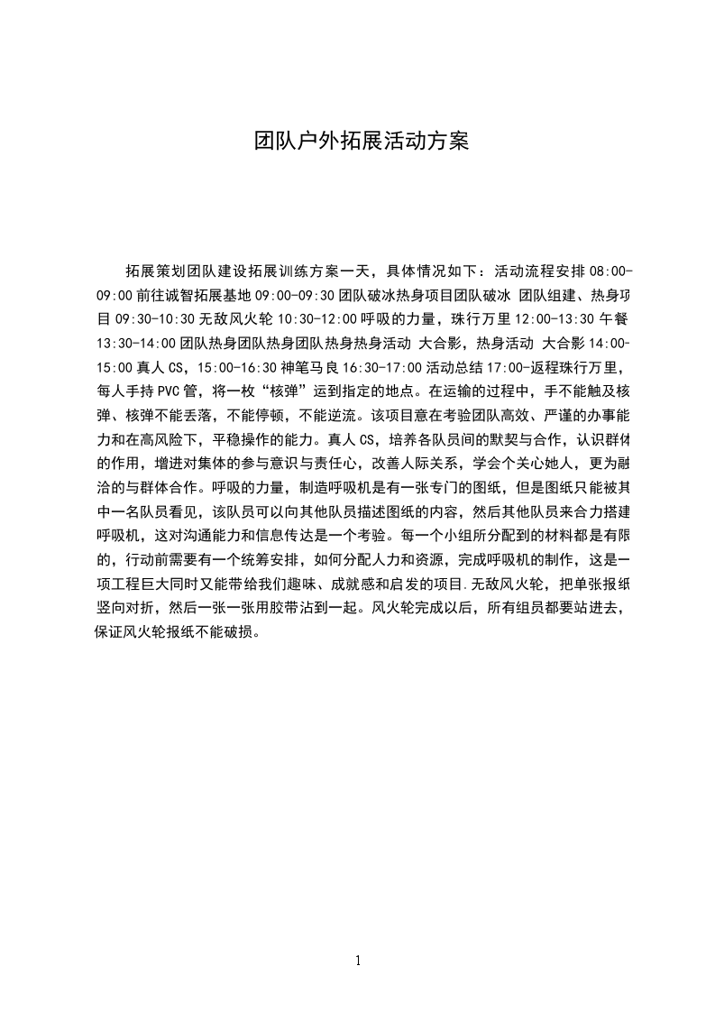 三、活动目的通过开展素质拓展训练活动,旨在创设种种情境,真实地触及知行人的心理、体魄和品格,使其以开放稳定的心态对挑战,激发创新活力,促进团队精神的形成,进而收到“磨练意志、陶冶情操、完善自我、熔炼团队”的良好效果。具体目的如下: