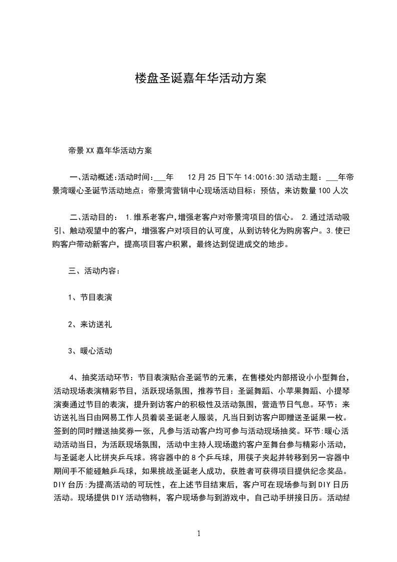 4、抽奖活动环节:节目表演贴合圣诞节的元素,在售楼处内部搭设小小型舞台,活动现场表演精彩节目,活跃现场氛围,推荐节目:圣诞舞蹈、小苹果舞蹈、小提琴演奏通过节目的表演,提升到访客户的积极性及活动氛围,营造节日气息。环节:来访送礼当日由网易工作人员着装圣诞老人服装,凡当日到访客户即赠送圣诞果一枚。签到的同时赠送抽奖券一张,凡参与活动客户均可参与活动现场抽奖。环节:暖心活动活动当日,为活跃现场氛围,活动中主持人现场邀约客户至舞台参与精彩小活动,与圣诞老人比拼夹乒乓球。将容器中的8个乒乓球,用筷子夹起并转移到另一容器中,期间手不能碰触乒乓球,如果挑战圣诞老人成功,获胜者可获得项目提供纪念奖品。DIY台历:为提高活动的可玩性,在上述节目结束后,客户可在现场参与到DIY日历活动。现场提供DIY活动物料,客户现场参与到游戏中,自己动手拼接日历。活动结束后可带走所拼接日历。环节:抽奖到访客户可参与当日现场抽奖活动,三等奖三名,送电子秤一个。二等奖二名,送电汤煲一个。一等奖一名,送挂烫机一个。