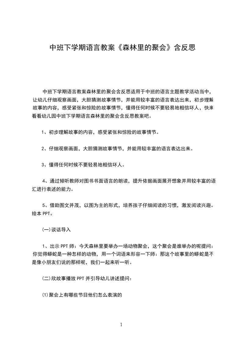 中班下学期语言教案森林里的聚会含反思适用于中班的语言主题教学活动当中,让幼儿仔细观察画面,大胆猜测故事情节,并能用较丰富的语言表达出来,初步理解故事的内容,感受紧张和惊险的故事情节,懂得任何时候不要轻易地相信坏人,快来看看幼儿园中班下学期语言森林里的聚会含反思教案吧。