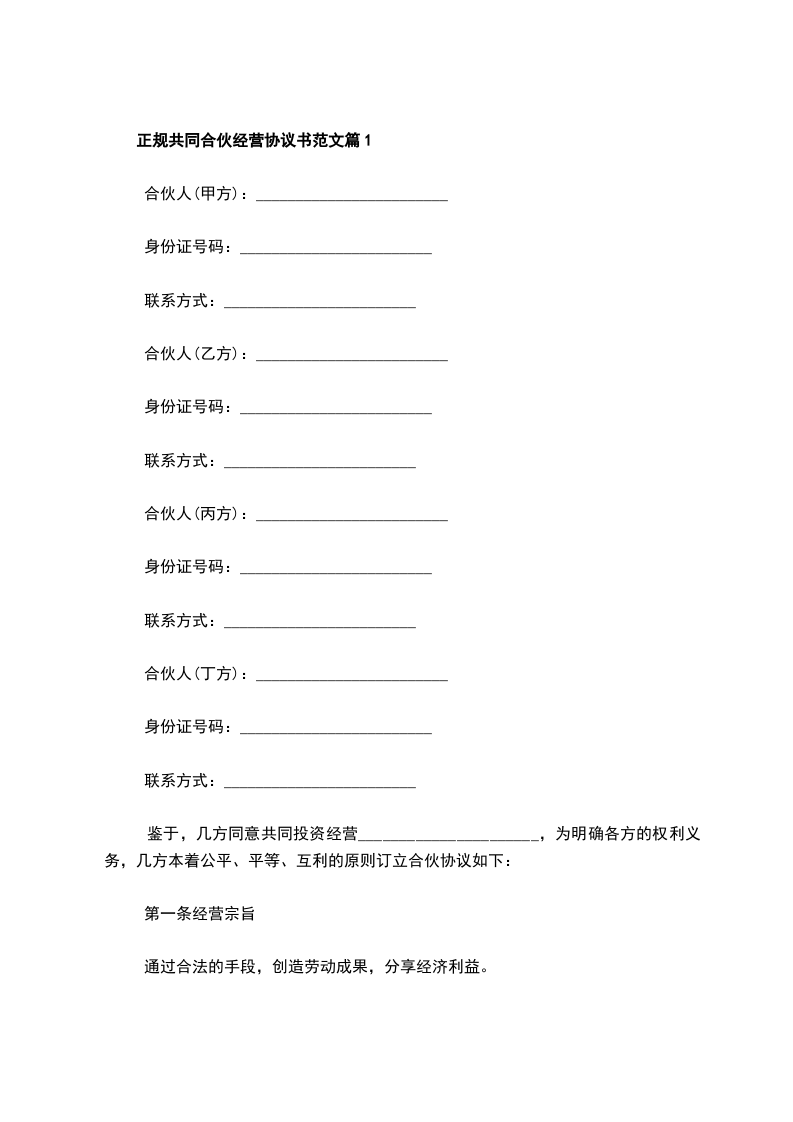 正规共同合伙经营协议书范文篇1
