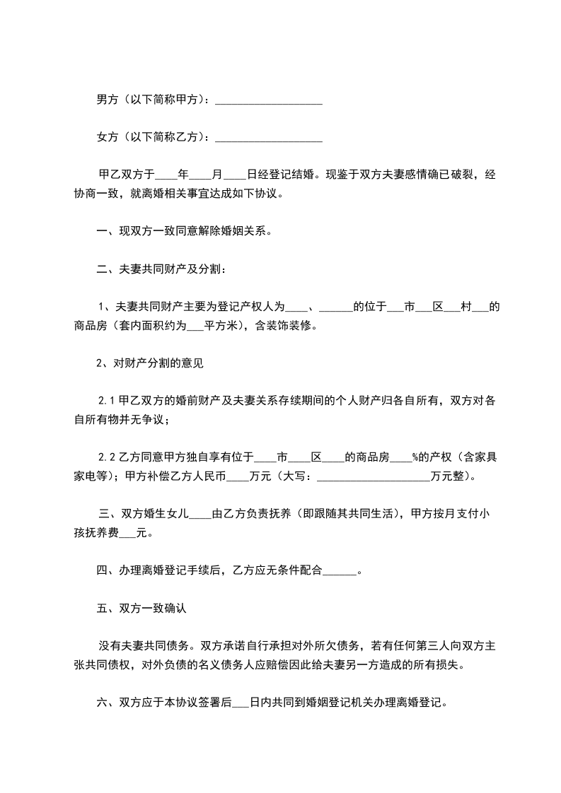 2.2乙方同意甲方独自享有位于____市____区____的商品房____%的产权(含家具家电等);甲方补偿乙方人民币____万元(大写:____________________万元整)。