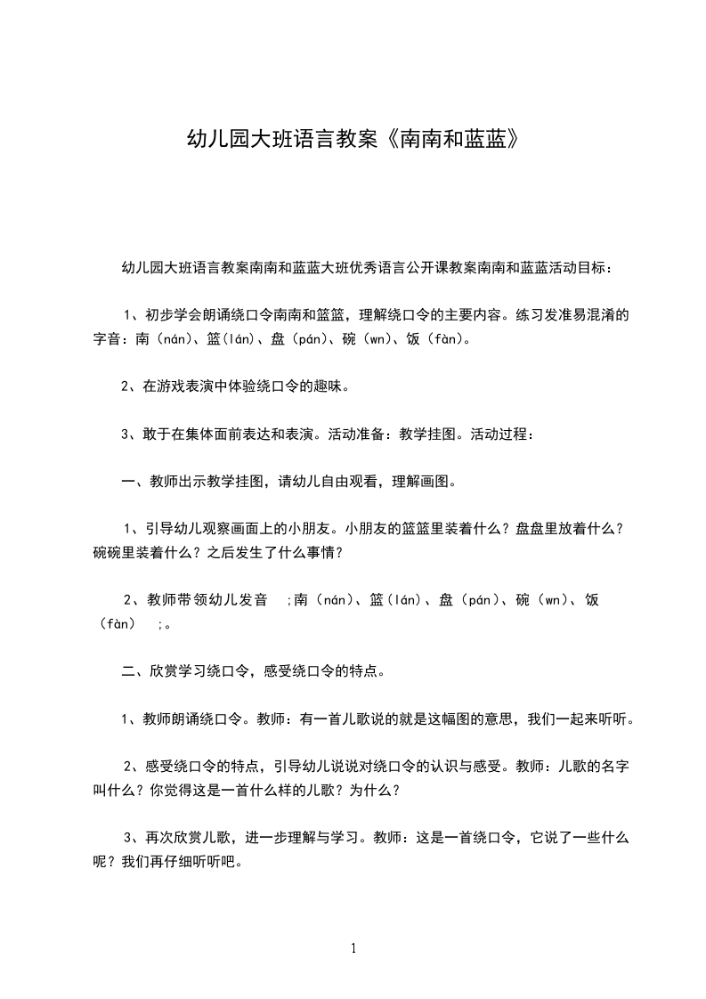 幼儿园大班语言教案南南和蓝蓝大班优秀语言公开课教案南南和蓝蓝活动目标: