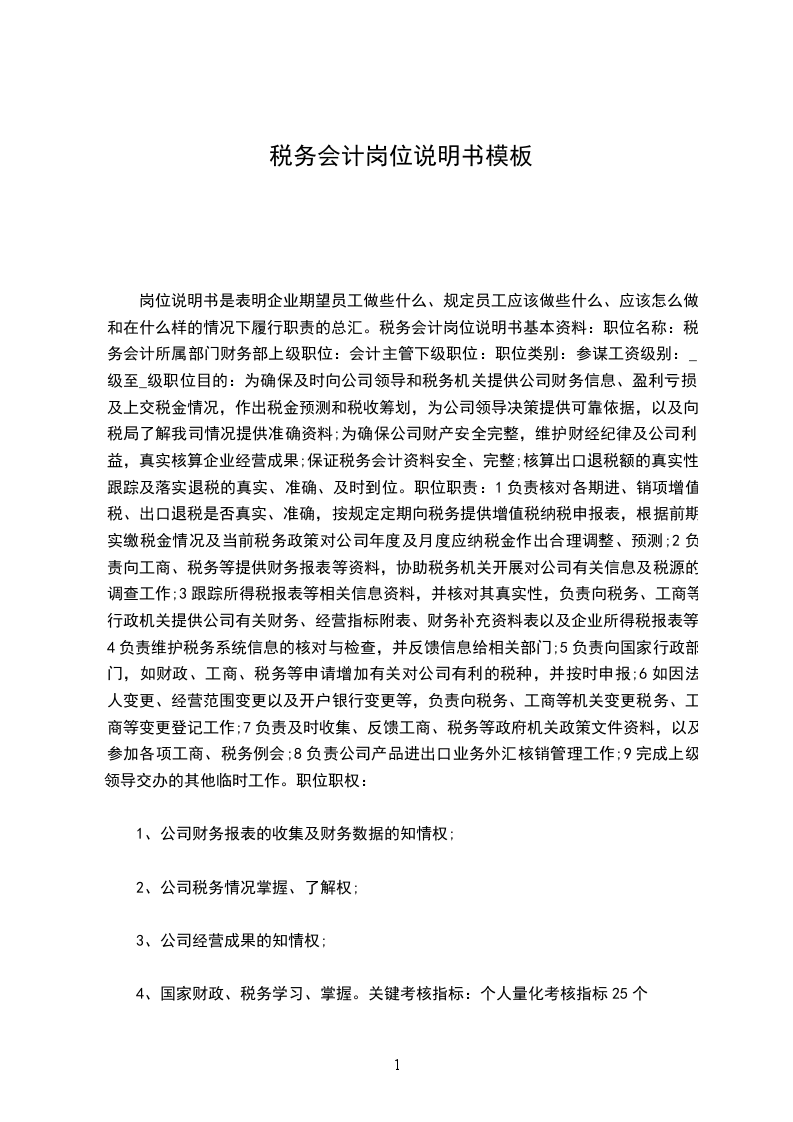 岗位说明书是表明企业期望员工做些什么、规定员工应该做些什么、应该怎么做和在什么样的情况下履行职责的总汇。税务会计岗位说明书基本资料:职位名称:税务会计所属部门财务部上级职位:会计主管下级职位:职位类别:参谋工资级别:_级至_级职位目的:为确保及时向公司领导和税务机关提供公司财务信息、盈利亏损及上交税金情况,作出税金预测和税收筹划,为公司领导决策提供可靠依据,以及向税局了解我司情况提供准确资料;为确保公司财产安全完整,维护财经纪律及公司利益,真实核算企业经营成果;保证税务会计资料安全、完整;核算出口退税额的真实性,跟踪及落实退税的真实、准确、及时到位。职位职责:1负责核对各期进、销项增值税、出口退税是否真实、准确,按规定定期向税务提供增值税纳税申报表,根据前期实缴税金情况及当前税务政策对公司年度及月度应纳税金作出合理调整、预测;2负责向工商、税务等提供财务报表等资料,协助税务机关开展对公司有关信息及税源的调查工作;3跟踪所得税报表等相关信息资料,并核对其真实性,负责向税务、工商等行政机关提供公司有关财务、经营指标附表、财务补充资料表以及企业所得税报表等;4负责维护税务系统信息的核对与检查,并反馈信息给相关部门;5负责向国家行政部门,如财政、工商、税务等申请增加有关对公司有利的税种,并按时申报;6如因法人变更、经营范围变更以及开户银行变更等,负责向税务、工商等机关变更税务、工商等变更登记工作;7负责及时收集、反馈工商、税务等政府机关政策文件资料,以及参加各项工商、税务例会;8负责公司产品进出口业务外汇核销管理工作;9完成上级领导交办的其他临时工作。职位职权: