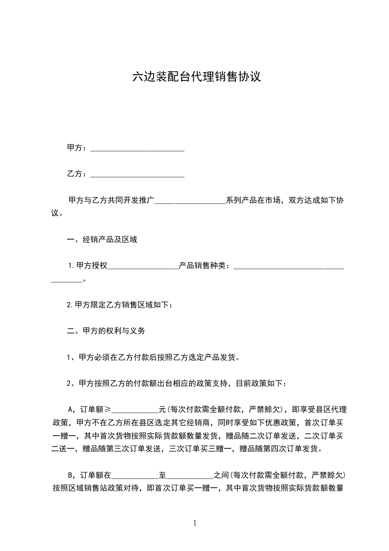 A,订单额≥____________元(每次付款需全额付款,严禁赊欠),即享受县区代理政策,甲方不在乙方所在县区选定其它经销商,同时享受如下优惠政策,首次订单买一赠一,其中首次货物按照实际货款额数量发货,赠品随二次订单发送,二次订单买二送一,赠品随第三次订单发送,三次订单买三赠一,赠品随第四次订单发货。