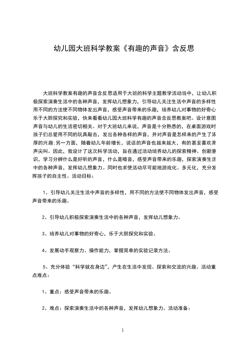 三、 结束部分小朋友,老师把生活中一些有趣的声音组成了一个小小的乐队,我们一起来演奏吧!(一一出示道具,让幼儿听听声音,说出相应的象声词。)(分组发放道具)小小乐队我的沙锤沙沙沙,我的盘子叮叮叮,我的小碗砰砰砰,我的锅盖铛铛铛,有趣的声音一起来,沙沙砰砰叮叮铛,真呀真热闹!小结:小朋友,生活中有各种各样有趣的声音,小朋友们以后仔细观察,试着模仿,就会发现很多乐趣。活动反思:本次活动的内容贴近幼儿生活,适合幼儿年龄特点。我在活动开始时,设计了猜一猜的游戏引出课题,然后出示了铃铛、响筒、口哨、竹筷、木梳、玻璃杯、瓶盖等简单直观的教具,让幼儿对声音产生兴趣,分别感受各种声音的不同,将目标重点牢牢抓住。在这一环节,还抓住了一个教育契机,通过口哨出现的不同场合,让幼儿自己分辨什么是噪音,联系到自己的实际生活中什么声音不应该出现的场合,引申到让幼儿知道怎么保护好自己的嗓子。接着通过分辨生活中各种不同的声音,鸟叫声、马蹄声、风声、打雷下雨声、笑声、掌声、牛叫声、公鸡报晓声音、汽车喇叭声、母鸡带小鸡声音、警车声、加油声、火车汽笛声,让幼儿感受声音的多样性。最后通过探索-发现操作,让幼儿在演奏中发挥幼儿想象力,从而达到目标的难点。整个活动设计合理,环环相扣,重难点把握得当,幼儿在自主的探索中、在轻松游戏的氛围中进行学习,参与的积极性高。小百科:声音(sound)是由物体振动产生的声波。是通过介质(空气或固体、液体)传播并能被人或动物听觉器官所感知的波动现象。最初发出振动(震动)的物体叫声源。声音以波的形式振动(震动)传播。声音是声波通过任何物质传播形成的运动。
