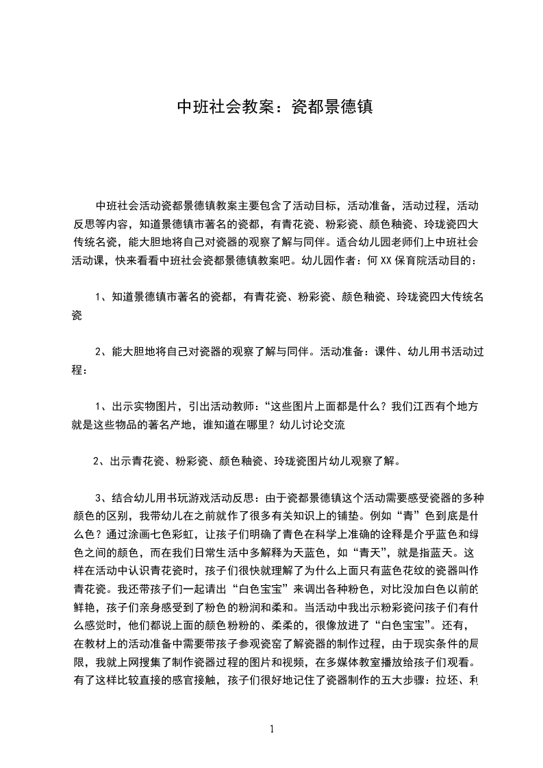 中班社会活动瓷都景德镇教案主要包含了活动目标,活动准备,活动过程,活动反思等内容,知道景德镇市著名的瓷都,有青花瓷、粉彩瓷、颜色釉瓷、玲珑瓷四大传统名瓷,能大胆地将自己对瓷器的观察了解与同伴。适合幼儿园老师们上中班社会活动课,快来看看中班社会瓷都景德镇教案吧。幼儿园作者:何XX保育院活动目的: