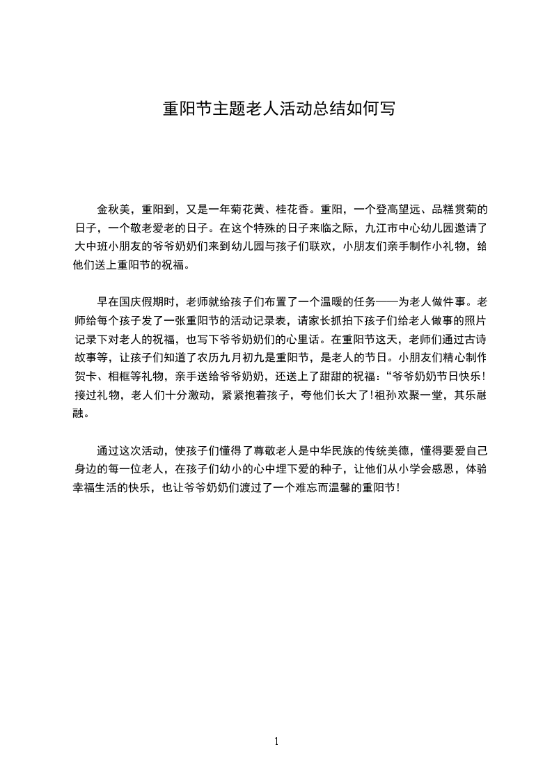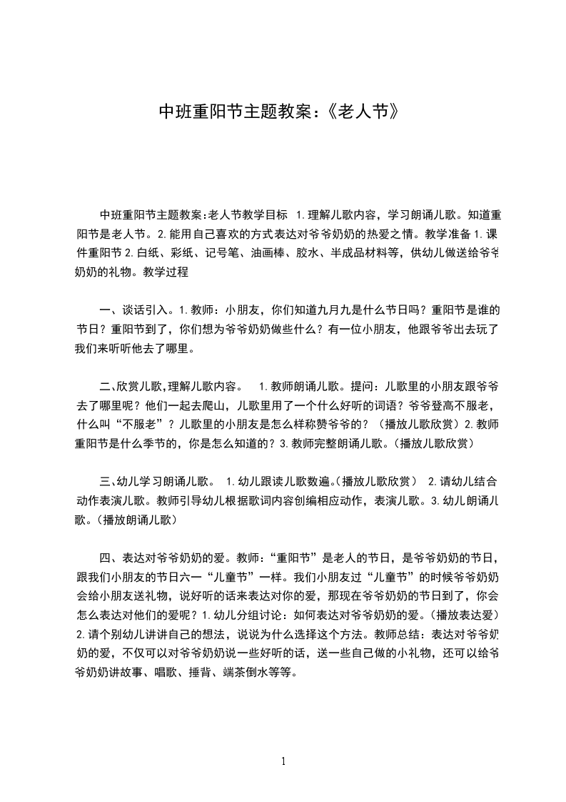 中班重阳节主题教案:老人节教学目标1.理解儿歌内容,学习朗诵儿歌。知道重阳节是老人节。2.能用自己喜欢的方式表达对爷爷奶奶的热爱之情。教学准备1.课件重阳节2.白纸、彩纸、记号笔、油画棒、胶水、半成品材料等,供幼儿做送给爷爷奶奶的礼物。教学过程