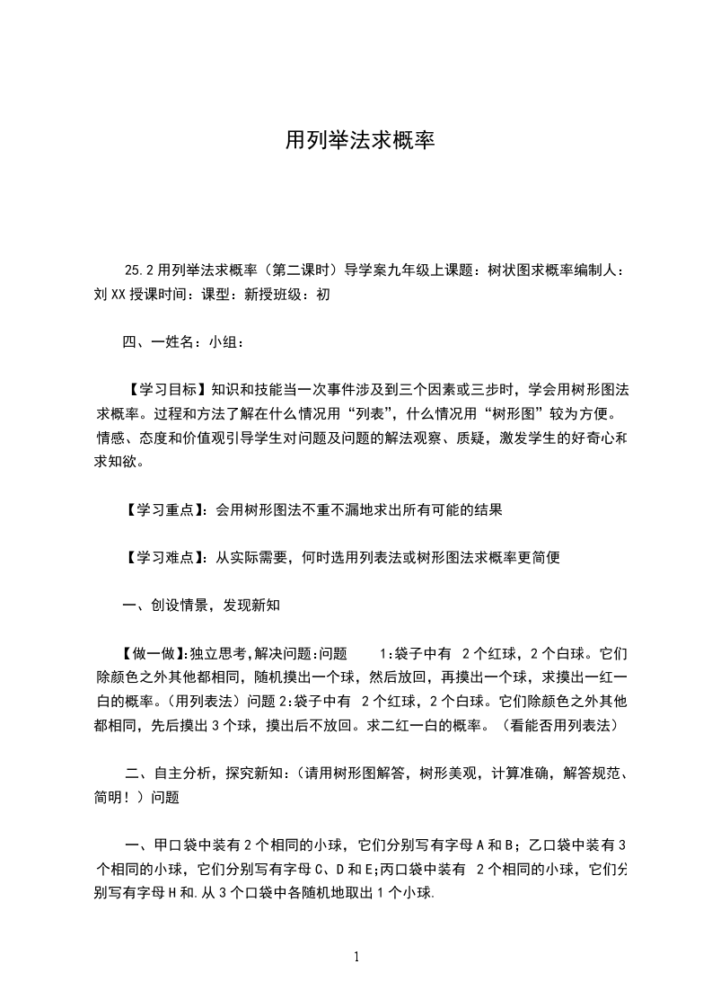 25.2用列举法求概率(第二课时)导学案九年级上课题:树状图求概率编制人:刘XX授课时间:课型:新授班级:初