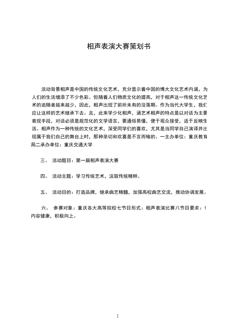 活动背景相声是中国的传统文化艺术,充分显示着中国的博大文化艺术内涵,为人们的生活增添了不少色彩。但随着人们物质文化的提高,对于相声这一传统文化艺术的追随者越来越少,因此,相声出现了前所未有的没落期。作为当代大学生,我们应让这样的艺术继承下去。且,此来学少化相声,涵艺术相声的特点是以对话为主要表现手段,对话必须是规范化的文学语言,要通俗易懂,便于观众接受,适于反映生活。相声作为一种传统的文化艺术,深受同学们的喜欢,尤其是当同学自己演译并出现属于我们自己的舞台上时,那种亲切和欢喜是不言而喻的。一主办单位:重庆教育局二承办单位:重庆交通大学