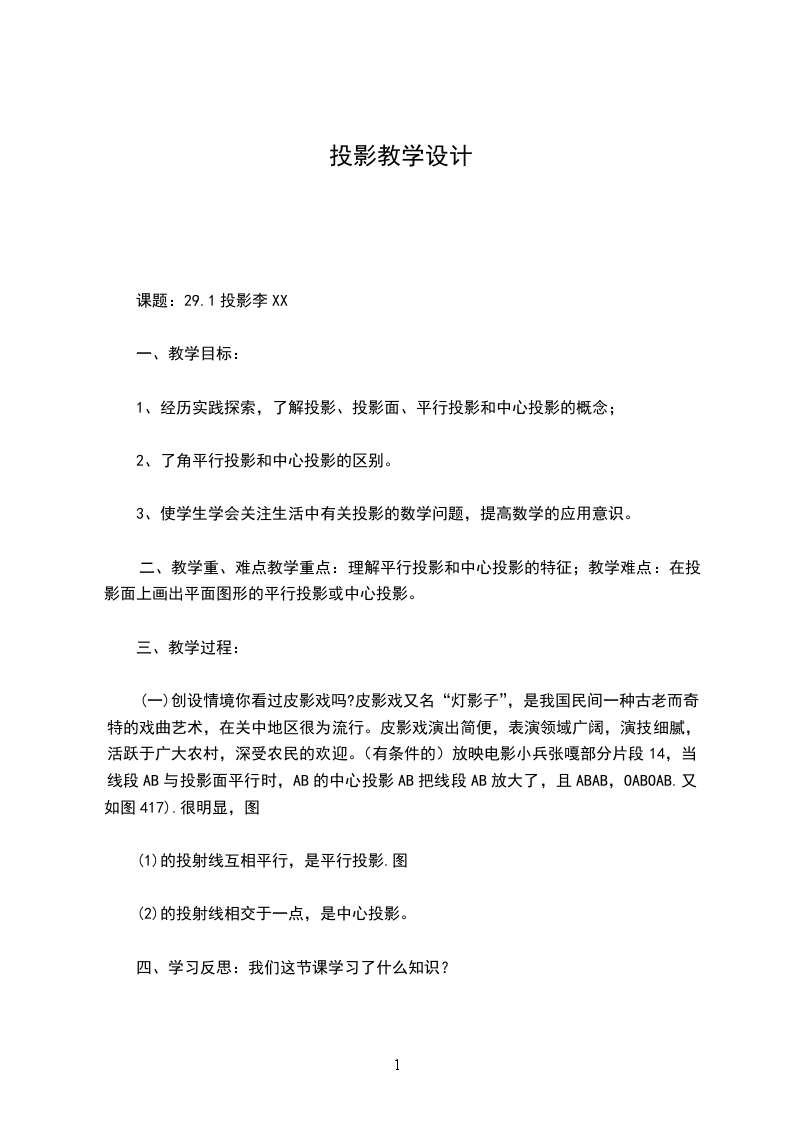 六、教学设计反思本节课的设计通过探究活动的开展探求投影的形成过程,通过对投影进一步理解,典型例题的分析,精选的随堂练习,学生一定能够掌握投影的有关知识,解决实际生活的问题。