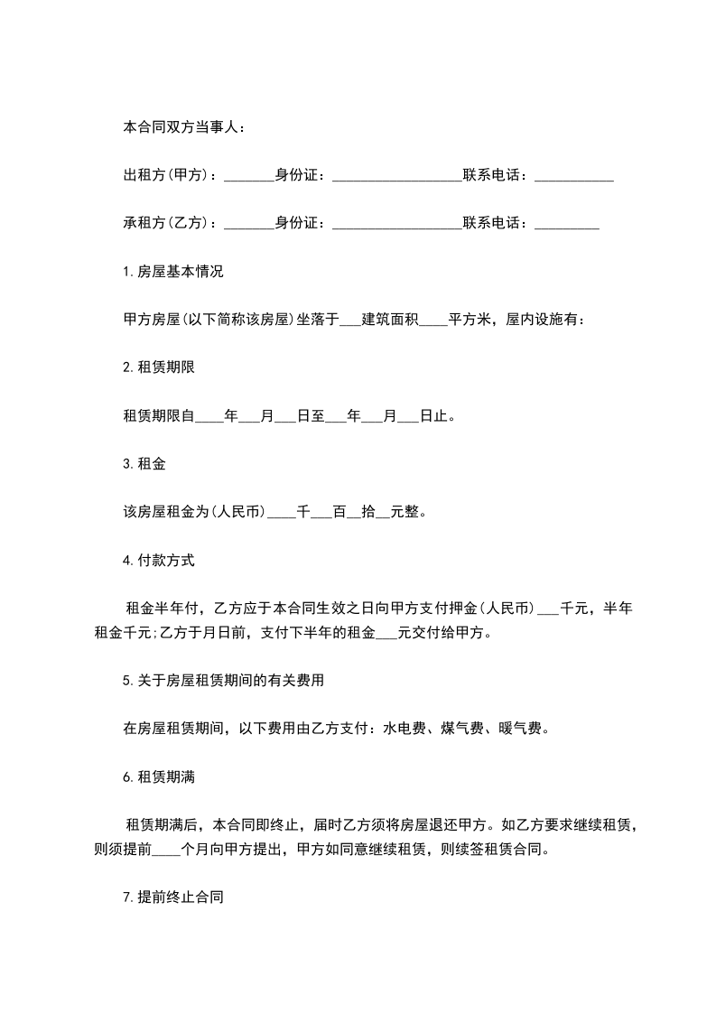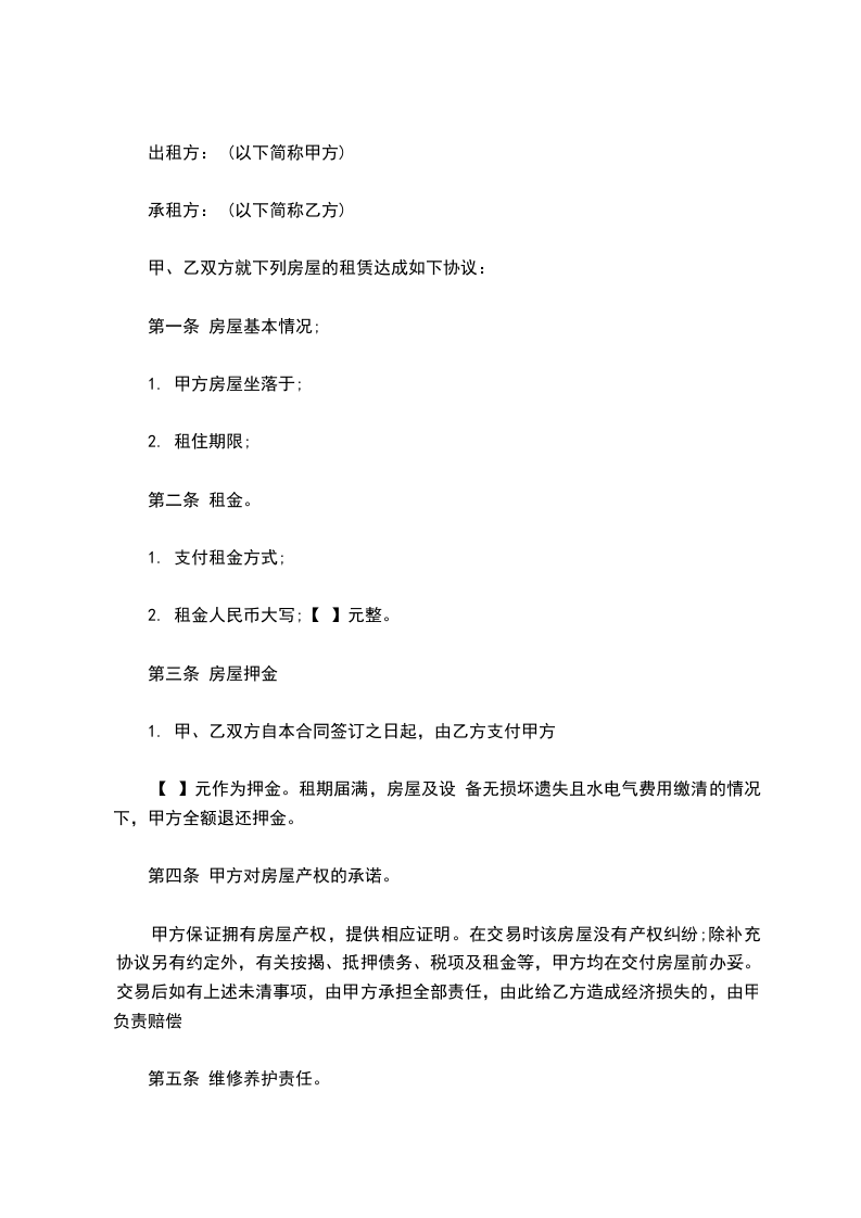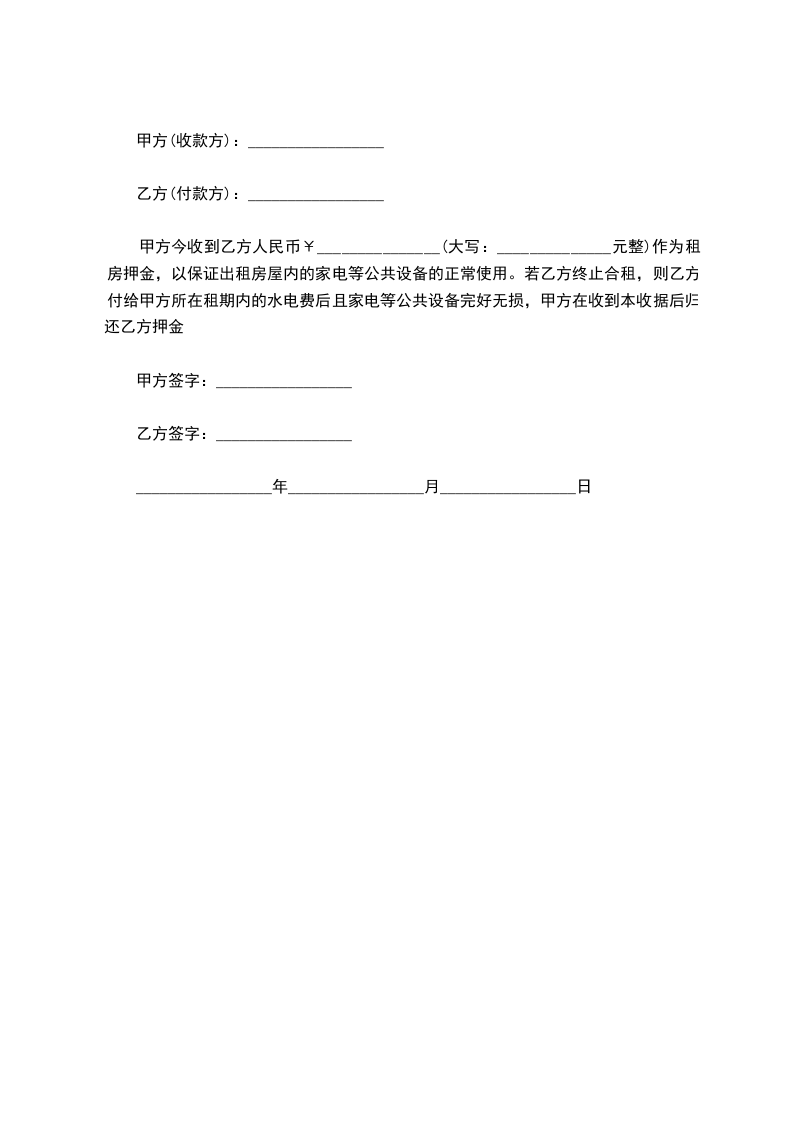 甲方今收到乙方人民币¥_______________(大写:______________元整)作为租房押金,以保证出租房屋内的家电等公共设备的正常使用。若乙方终止合租,则乙方付给甲方所在租期内的水电费后且家电等公共设备完好无损,甲方在收到本收据后归还乙方押金
