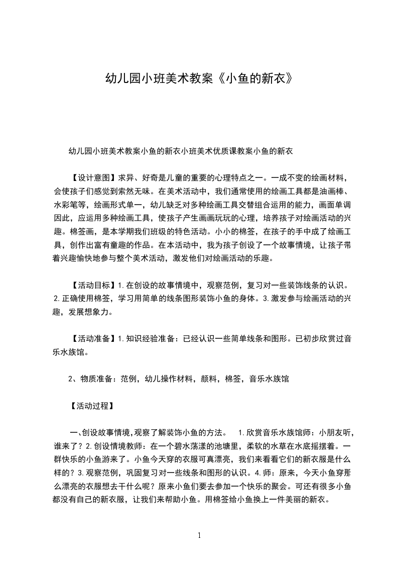 【活动目标】1.在创设的故事情境中,观察范例,复习对一些装饰线条的认识。2.正确使用棉签,学习用简单的线条图形装饰小鱼的身体。3.激发参与绘画活动的兴趣,发展想象力。