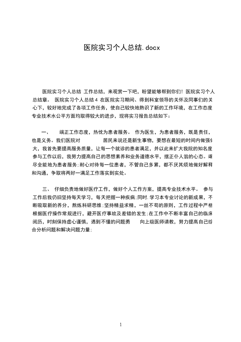 医院实习个人总结 工作总结,来观赏一下吧,盼望能够帮到你们! 医院实习个人总结章。 医院实习个人总结4 在医院实习期间、得到科室领导的关怀及同事们的关心下,较好地完成了各项工作任务,使自己较快地熟识了新的工作环境,在工作态度、专业技术水公平方面均取得较大的进步,现将实习报告总结如下: