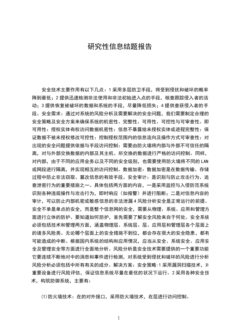 安全技术主要作用有以下几点:1采用多层防卫手段,将受到侵扰和破坏的概率降到最低;2提供迅速检测非法使用和非法初始进入点的手段,核查跟踪侵入者的活动;3提供恢复被破坏的数据和系统的手段,尽量降低损失;4提供查获侵入者的手段。安全需求:通过对系统的风险分析及需要解决的安全问题,我们需要制定合理的安全策略及安全方案来确保系统的机密性、完整性、可用性、可控性与可审查性。即,可用性:授权实体有权访问数据机密性:信息不暴露给未授权实体或进程完整性:保证数据不被未授权修改可控性:控制授权范围内的信息流向及操作方式可审查性:对出现的安全问题提供依据与手段访问控制:需要由防火墙将内部与外部不可信任的隔离,对与外部交换数据的内部及其主机、所交换的数据进行严格的访问控制。同样,对内部,由于不同的应用业务以及不同的安全级别,也需要使用防火墙将不同的LAN或网段进行隔离,并实现相互的访问控制。数据加密:数据加密是在数据传输、存储过程中防止非法窃取、篡改信息的有效手段。安全审计:是识别与防止攻击行为、追查泄密行为的重要措施之一。具体包括两方面的内容,一是采用监控与入侵防范系统,识别各种违规操作与攻击行为,即时响应(如报警)并进行阻断;二是对信息内容的审计,可以防止内部机密或敏感信息的非法泄漏4风险分析安全是正常运行的前提。安全不单是单点的安全,而是整个信息网的安全,需要从物理、系统、应用和管理方面进行立体的防护。要知道如何防护,首先需要了解安全风险来自于何处。安全系统必须包括技术和管理两方面,涵盖物理层、系统层、层、应用层和管理层各个层面上的诸多风险类。无论哪个层面上的安全措施不到位,都会存在很大的安全隐患,都有可能造成的中断。根据国内系统的结构和应用情况,应当从安全、系统安全、应用安全及管理安全等方面进行全面地分析。风险分析是安全技术需要提供的一个重要功能。它要连续不断地对中的消息和事件进行检测,对系统受到侵扰和破坏的风险进行分析。风险分析必须包括中所有有关的成分。解决方案:安全策略:1采用漏洞扫描技术,对重要设备进行风险评估,保证信息系统尽量在最优的状况下运行。2采用各种安全技术,构筑防御系统,主要有: