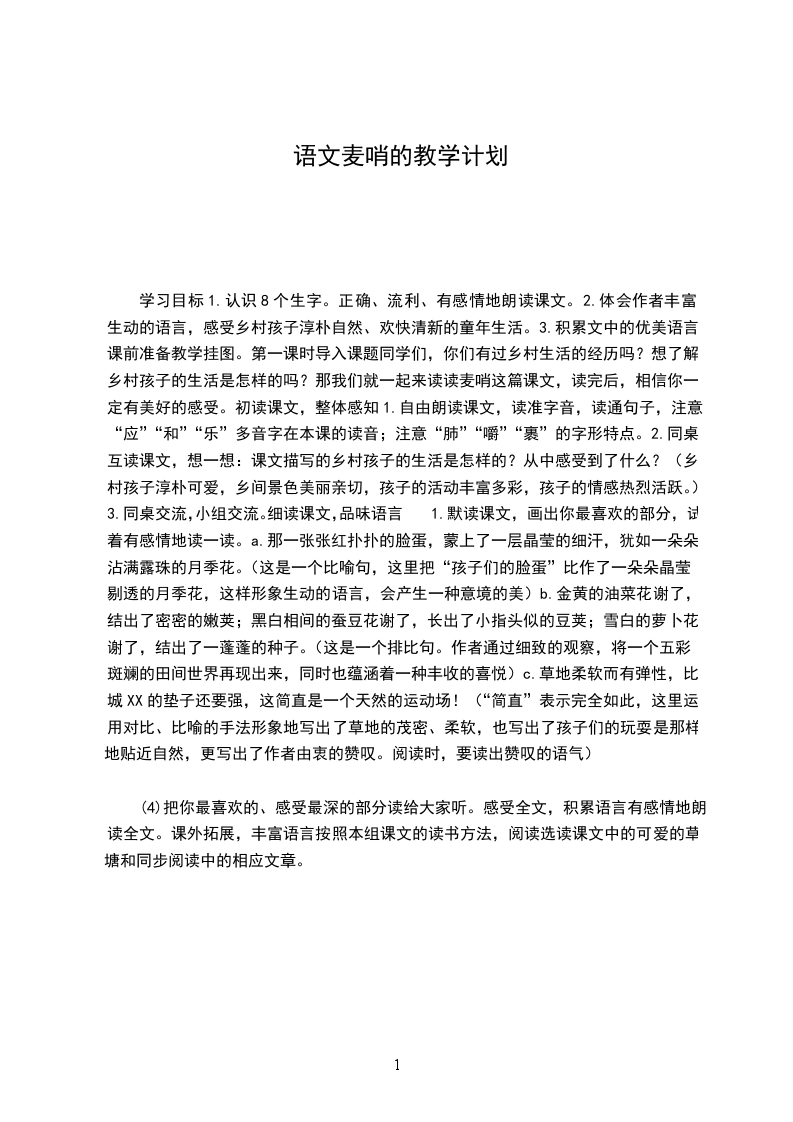 学习目标1.认识8个生字。正确、流利、有感情地朗读课文。2.体会作者丰富生动的语言,感受乡村孩子淳朴自然、欢快清新的童年生活。3.积累文中的优美语言。课前准备教学挂图。第一课时导入课题同学们,你们有过乡村生活的经历吗?想了解乡村孩子的生活是怎样的吗?那我们就一起来读读麦哨这篇课文,读完后,相信你一定有美好的感受。初读课文,整体感知1.自由朗读课文,读准字音,读通句子,注意“应”“和”“乐”多音字在本课的读音;注意“肺”“嚼”“裹”的字形特点。2.同桌互读课文,想一想:课文描写的乡村孩子的生活是怎样的?从中感受到了什么?(乡村孩子淳朴可爱,乡间景色美丽亲切,孩子的活动丰富多彩,孩子的情感热烈活跃。)3.同桌交流,小组交流。细读课文,品味语言1.默读课文,画出你最喜欢的部分,试着有感情地读一读。a.那一张张红扑扑的脸蛋,蒙上了一层晶莹的细汗,犹如一朵朵沾满露珠的月季花。(这是一个比喻句,这里把“孩子们的脸蛋”比作了一朵朵晶莹剔透的月季花,这样形象生动的语言,会产生一种意境的美)b.金黄的油菜花谢了,结出了密密的嫩荚;黑白相间的蚕豆花谢了,长出了小指头似的豆荚;雪白的萝卜花谢了,结出了一蓬蓬的种子。(这是一个排比句。作者通过细致的观察,将一个五彩斑斓的田间世界再现出来,同时也蕴涵着一种丰收的喜悦)c.草地柔软而有弹性,比城XX的垫子还要强,这简直是一个天然的运动场!(“简直”表示完全如此,这里运用对比、比喻的手法形象地写出了草地的茂密、柔软,也写出了孩子们的玩耍是那样地贴近自然,更写出了作者由衷的赞叹。阅读时,要读出赞叹的语气)