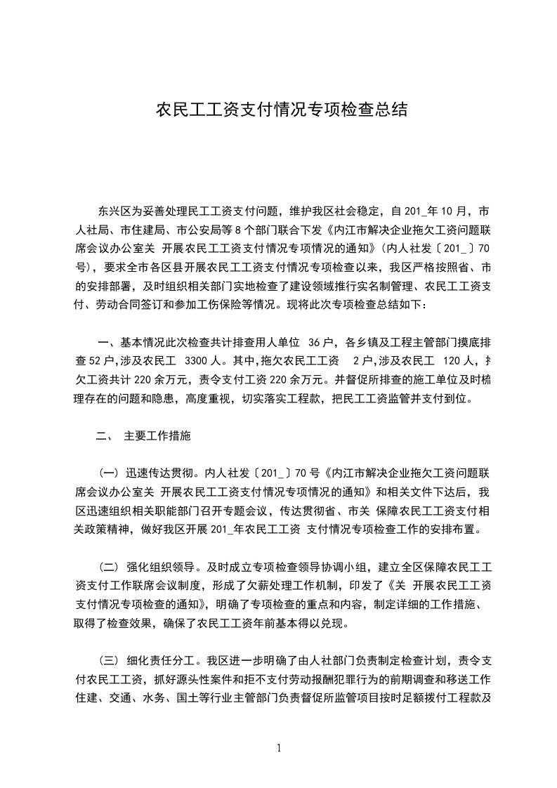 五、认真做好材料报送和专项检查总结工作(一)请各成员单位和行业主管部门于2024年12月10日前将自查自纠情况(即用人单位工资支付自查自纠情况汇总表)同时报送本级解决企业工资拖欠问题局际联席会议办公室和市级行业主管部门,县解决企业工资拖欠问题局际联席会议办公室于2024年12月12日向市级解决企业工资拖欠问题局际联席会议办公室报送本地区组织自查自纠情况,12月21日前报送本地专项检查工作阶段进展情况(即农民工工资支付专项检查情况表)。(二)县解决企业工资拖欠问题局际联席会议办公室及时对本地专项检查情况进行总结,梳理存在的问题,分析其形成的原因,提出相应的对策建议,于202a年1月29日前报送本地区专项检查书面总结材料(附农民工工资支付专项检查情况表)。