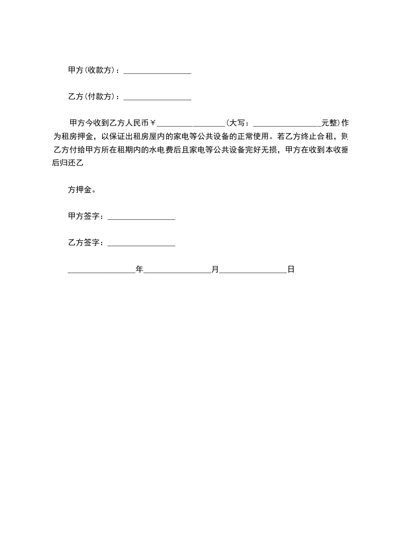 甲方今收到乙方人民币¥_________________(大写:_________________元整)作为租房押金,以保证出租房屋内的家电等公共设备的正常使用。若乙方终止合租,则乙方付给甲方所在租期内的水电费后且家电等公共设备完好无损,甲方在收到本收据后归还乙