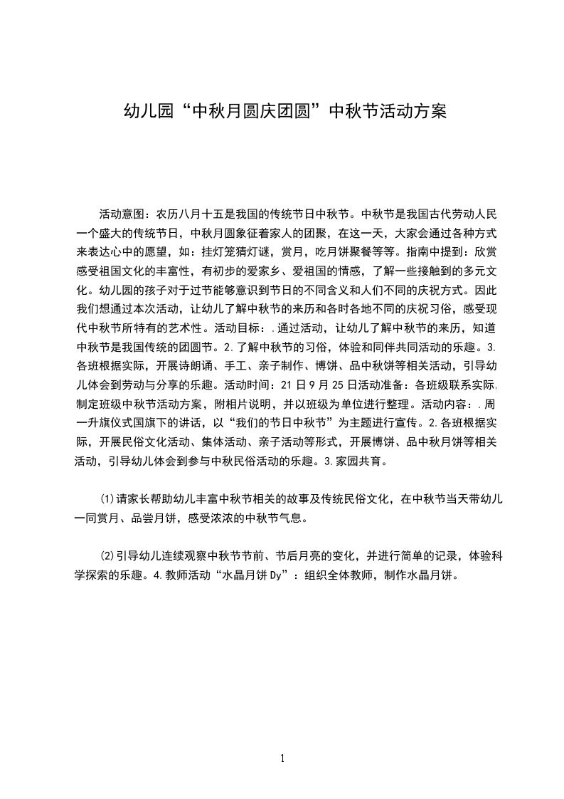 活动意图:农历八月十五是我国的传统节日中秋节。中秋节是我国古代劳动人民一个盛大的传统节日,中秋月圆象征着家人的团聚,在这一天,大家会通过各种方式来表达心中的愿望,如:挂灯笼猜灯谜,赏月,吃月饼聚餐等等。指南中提到:欣赏、感受祖国文化的丰富性,有初步的爱家乡、爱祖国的情感,了解一些接触到的多元文化。幼儿园的孩子对于过节能够意识到节日的不同含义和人们不同的庆祝方式。因此,我们想通过本次活动,让幼儿了解中秋节的来历和各时各地不同的庆祝习俗,感受现代中秋节所特有的艺术性。活动目标:.通过活动,让幼儿了解中秋节的来历,知道中秋节是我国传统的团圆节。2.了解中秋节的习俗,体验和同伴共同活动的乐趣。3.各班根据实际,开展诗朗诵、手工、亲子制作、博饼、品中秋饼等相关活动,引导幼儿体会到劳动与分享的乐趣。活动时间:21日9月25日活动准备:各班级联系实际,制定班级中秋节活动方案,附相片说明,并以班级为单位进行整理。活动内容:.周一升旗仪式国旗下的讲话,以“我们的节日中秋节”为主题进行宣传。2.各班根据实际,开展民俗文化活动、集体活动、亲子活动等形式,开展博饼、品中秋月饼等相关活动,引导幼儿体会到参与中秋民俗活动的乐趣。3.家园共育。
