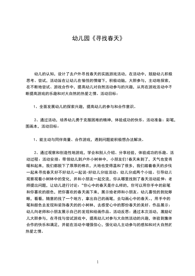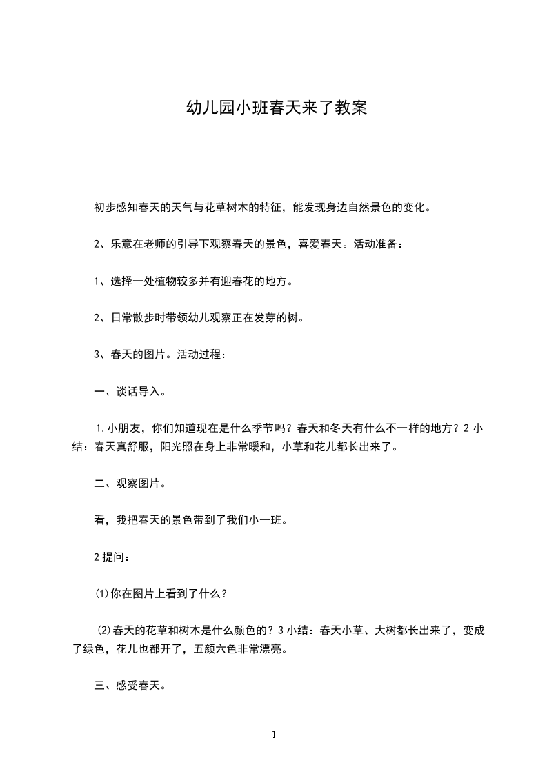 幼儿园小班春天教案春天来了幼儿园小班春天教案:春天来了教师:屈老师活动由来:俗话说:一年之计在于春,春天代表着希望,充满了生机。春天来了,天气变暖了,万物复苏,有着明显的季节变化特征,非常适合幼儿观察春天的变化现象,为了能有效的利用大自然的现有资源,将自然资源融入幼儿园的一日生活活动中,我特意为托班幼儿设计了柳树发芽了的科学活动方案,旨在培养幼儿对科学活动的兴趣和参与自然科学活动的积极性,表达热爱春天,热爱大自然的感情。活动目标: