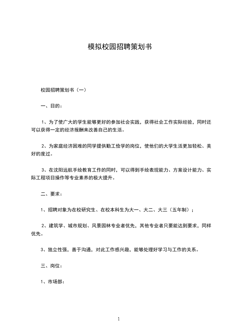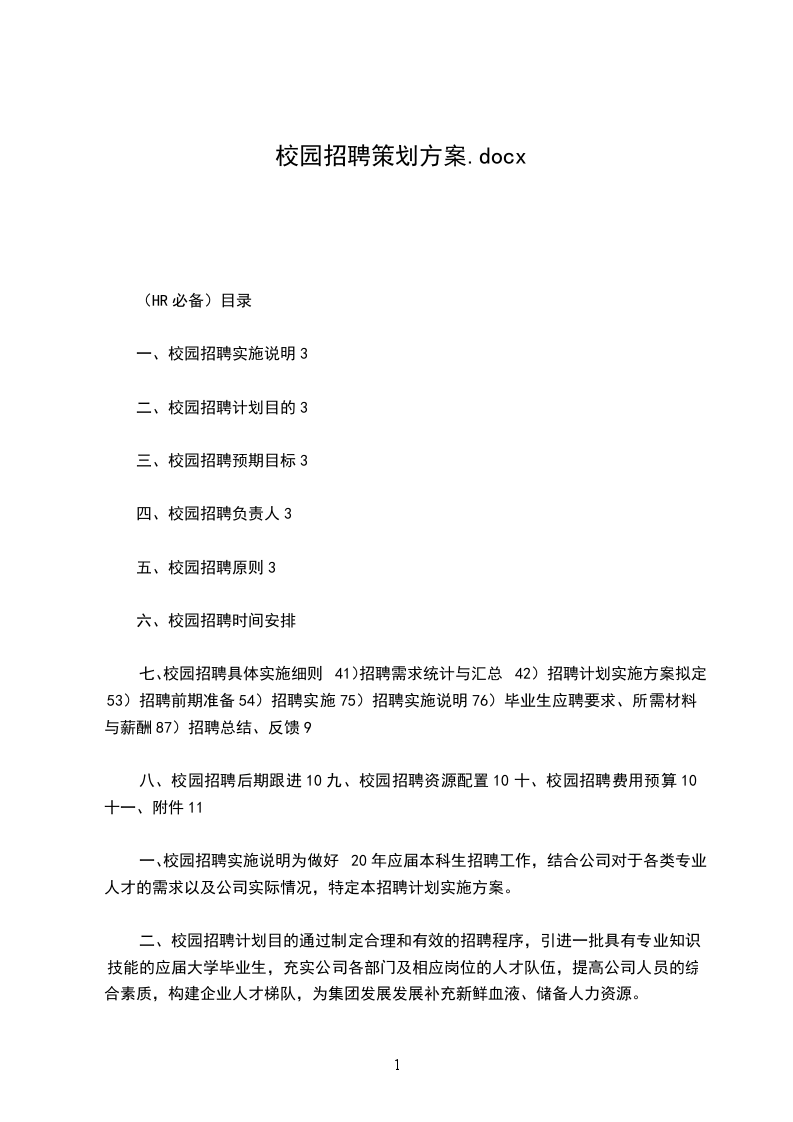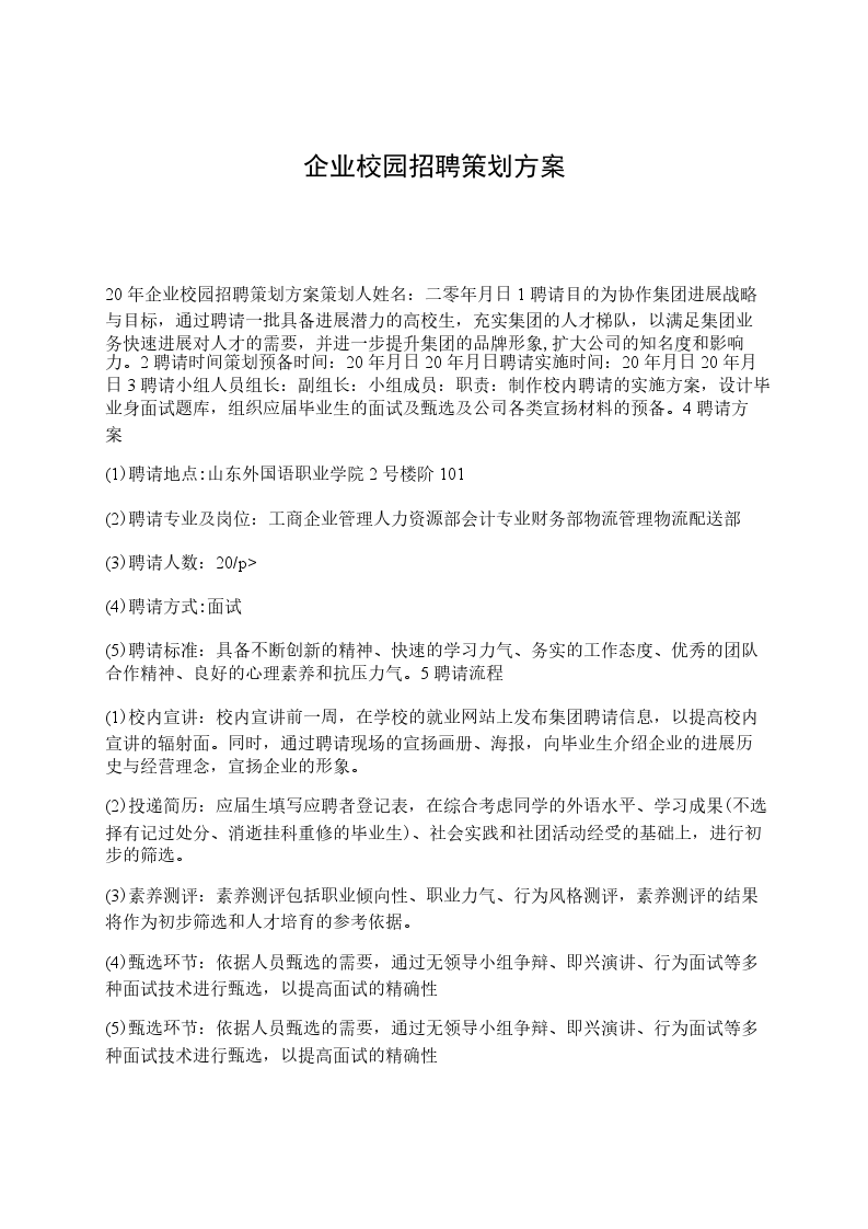 20年企业校园招聘策划方案策划人姓名:二零年月日1聘请目的为协作集团进展战略与目标,通过聘请一批具备进展潜力的高校生,充实集团的人才梯队,以满足集团业务快速进展对人才的需要,并进一步提升集团的品牌形象,扩大公司的知名度和影响力。2聘请时间策划预备时间:20年月日20年月日聘请实施时间:20年月日20年月日3聘请小组人员组长:副组长:小组成员:职责:制作校内聘请的实施方案,设计毕业身面试题库,组织应届毕业生的面试及甄选及公司各类宣扬材料的预备。4聘请方案