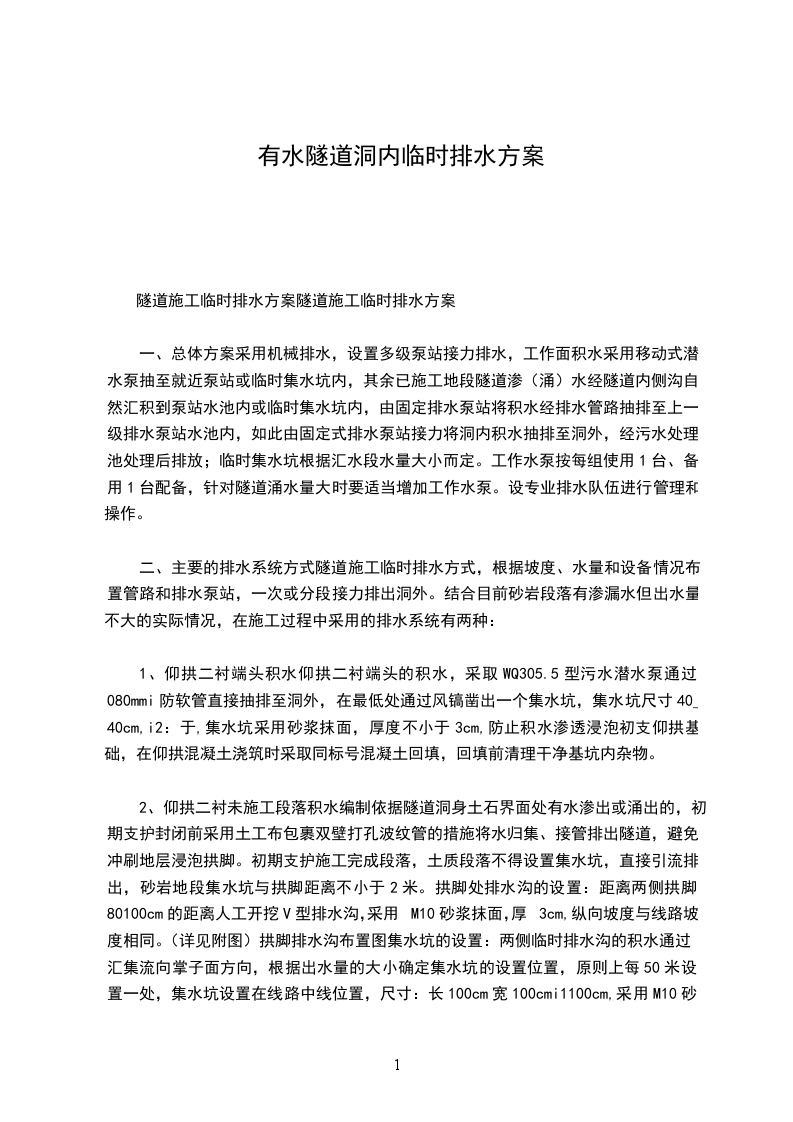 1、仰拱二衬端头积水仰拱二衬端头的积水,采取WQ305.5型污水潜水泵通过080mmi防软管直接抽排至洞外,在最低处通过风镐凿出一个集水坑,集水坑尺寸40_40cm,i2:于,集水坑采用砂浆抹面,厚度不小于3cm,防止积水渗透浸泡初支仰拱基础,在仰拱混凝土浇筑时采取同标号混凝土回填,回填前清理干净基坑内杂物。