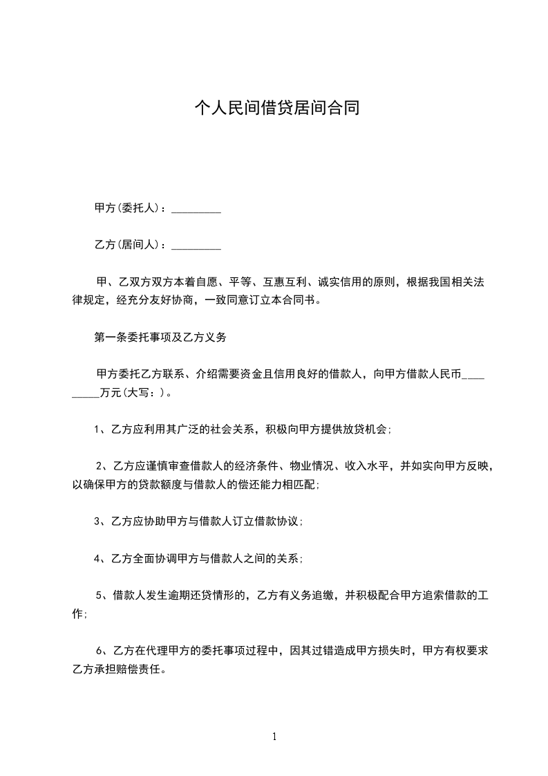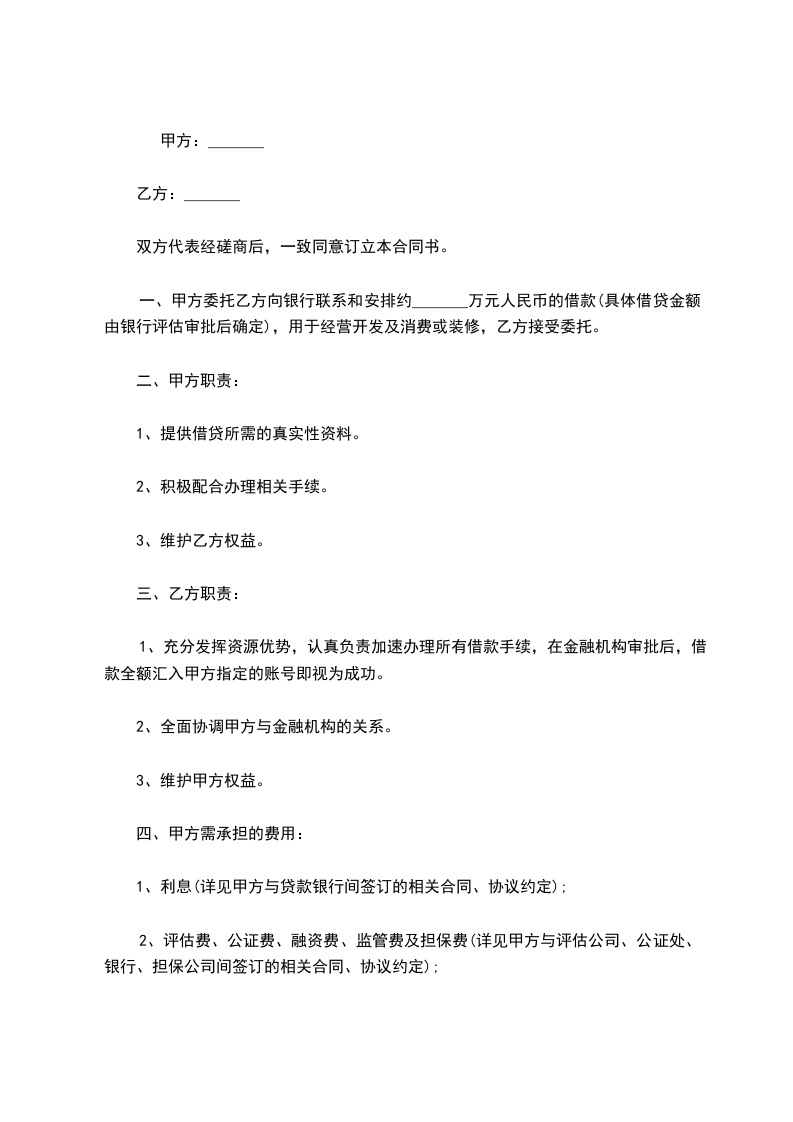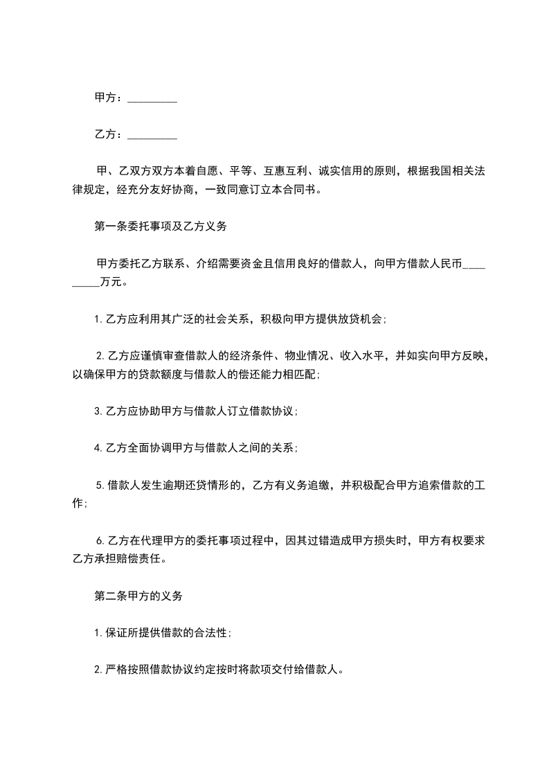 甲方委托乙方联系、介绍需要资金且信用良好的借款人,向甲方借款人民币 _________万元(大写: )。