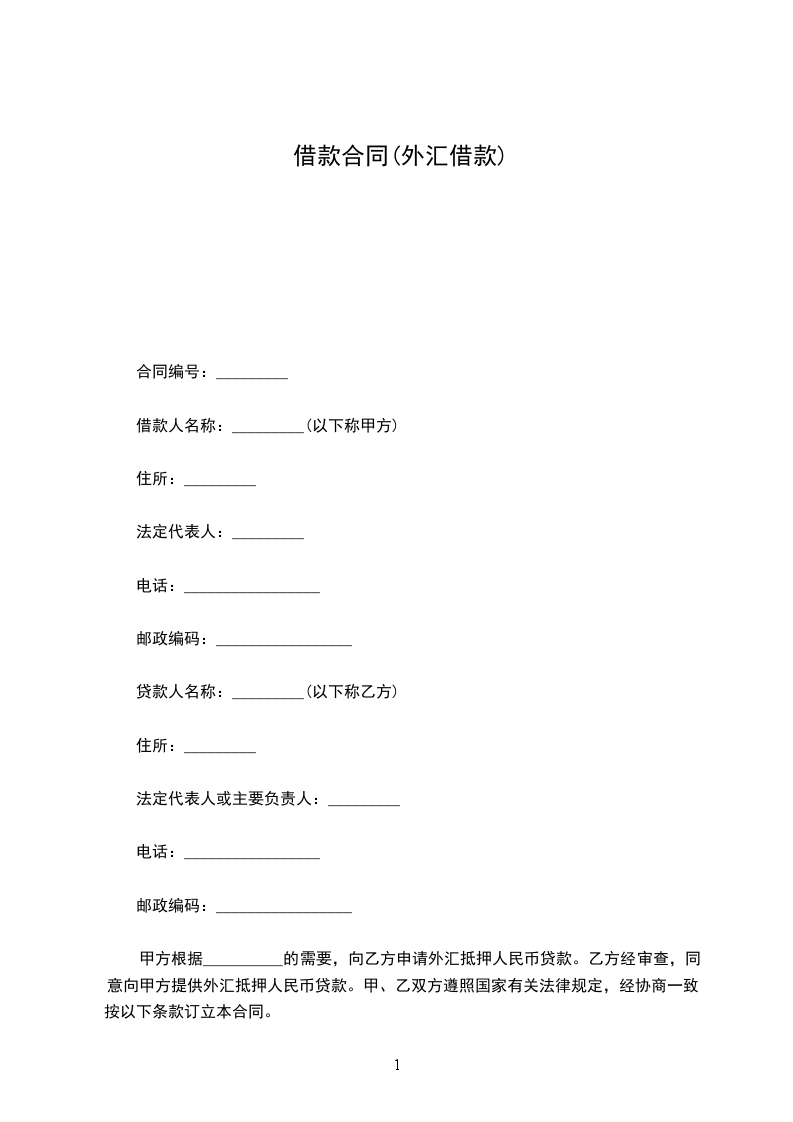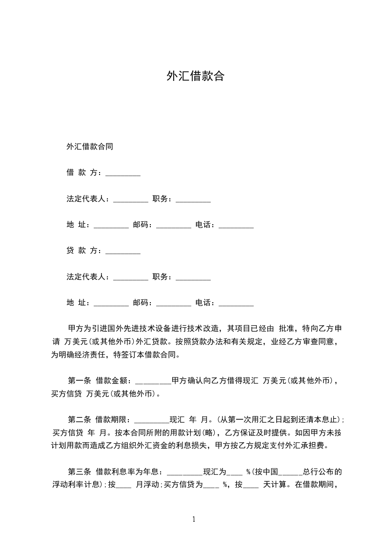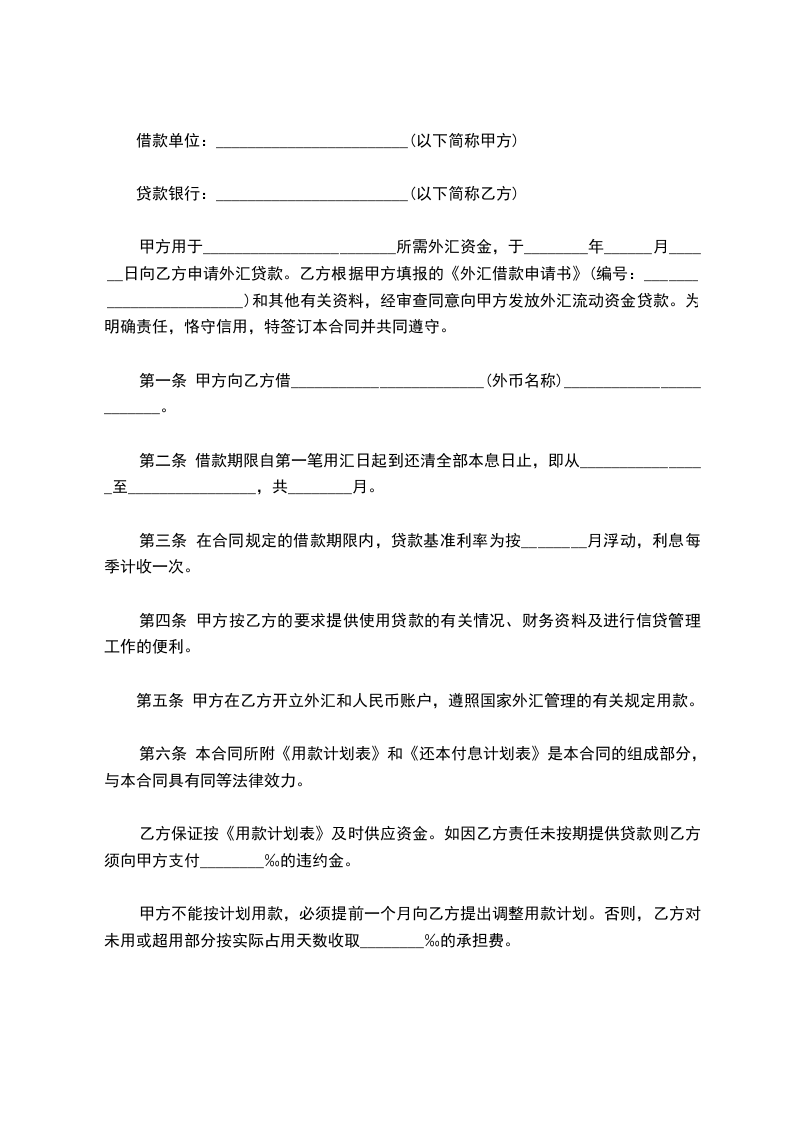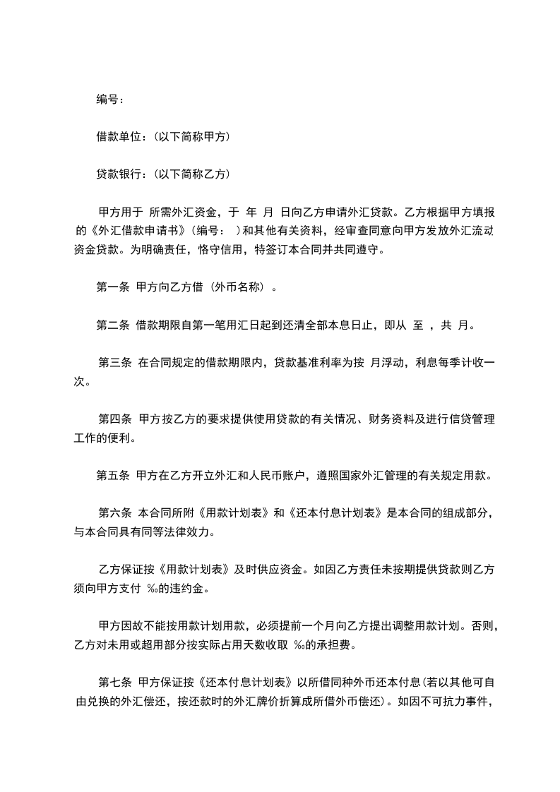 编号:借款单位:(以下简称甲方)贷款银行:(以下简称乙方)甲方用于所需外汇资金,_年月日向乙方申请外汇贷款。乙方依据甲方填报的外汇借款申请书(编号:)和其他有关资料,经审查同意向甲方发放外汇流淌资金贷款。为明确责任,恪守信用,特签订本合同并共同遵守。
