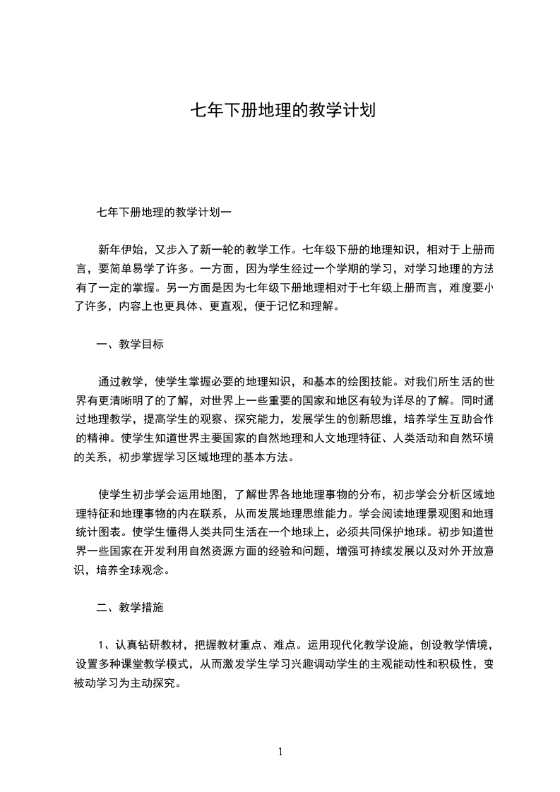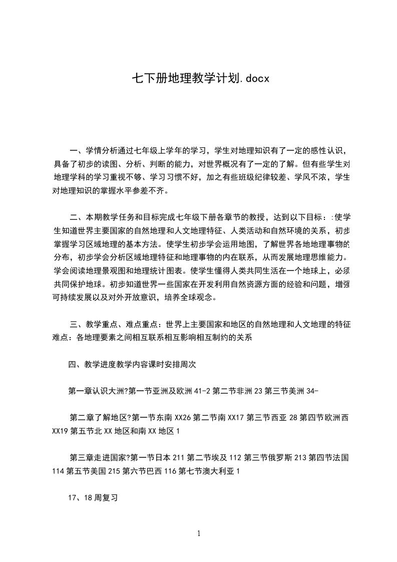 教学计划是课程设置的整体规划,它规定不同课程类型相互结构的方式,也规定了不同课程在管理学习方式的要求及其所占比例。新年伊始,又步入了新一轮的教学工作。七年级下册的地理知识,相对于上册而言,要简单易学了许多。一方面,因为学生经过一个学期的学习,对学习地理的方法有了一定的掌握。另一方面是因为七年级下册地理相对于七年级上册而言,难度要小了许多,内容上也更具体、更直观,便于记忆和理解。