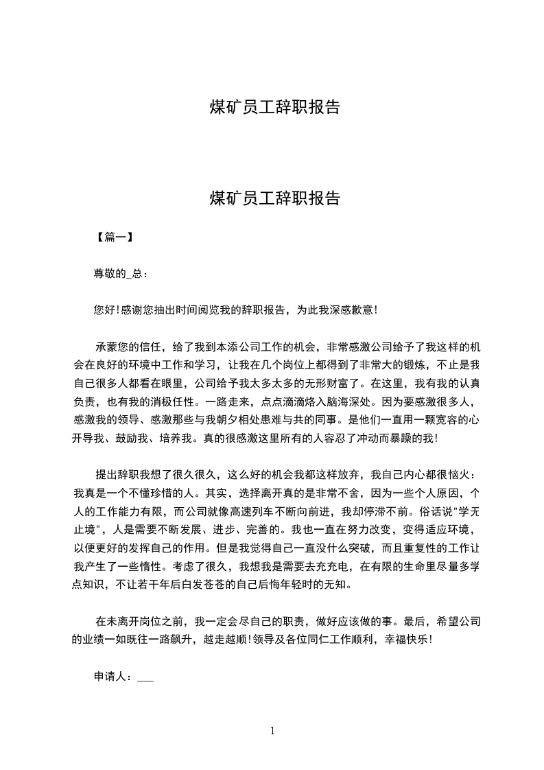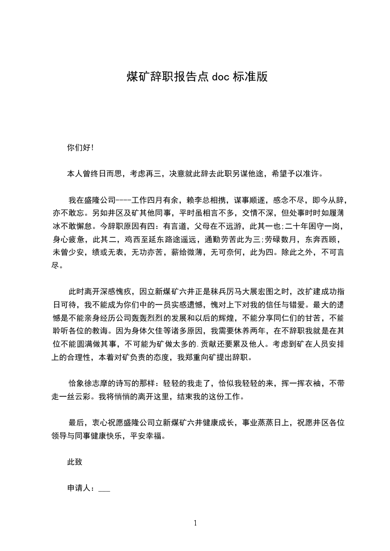 敬重的_总:您好,很愧疚在这个时间段向您提出辞职申请。如水的时间匆忙流走,一去不回。来火铺矿的日子四月有余。这段时间,我经受了几次系统的学习,经过两个月的理论学习,经过一个月的专业培训。几个月下来,无论是从工作上还是为人上我都受益匪浅。煤炭给了我一柱光,照亮了我们前进的路。但是朝向光走去的时候,身后总会有影子。我稍一回头,瞥见了自己的影子。四个月中,我始终履行自己定下的诺言:即来之,那么安之。工作之中,不管遇到多么刁难的活,不管师傅对自己发了多少牢骚,诉说了多少抱怨,数落了多少冷嘲热讽,也不管自己的心情有多么不好,在面对师傅的时候,都要始终保持一个笑脸,始终树立起自己的微笑来实现公司的价值制造条件,完成任务,这是我们工作的真正重点,是工作的意义所在,但是我并没有为公司制造多大的价值。在经过仔细剖析以后,我觉察,四个月的时间,已经把我和工作的不合适表现得淋漓尽致。自身存在问题较多,即使再给自己一段时间,也并没有多大潜力可供开发,没有多大能量可供释放,没有多高的台阶可以去走。或许,我在努力奔跑,却可能如同原地打转,我跑出的可能只是一个又一个圆之又圆的圈,却不是更加笔直宽阔的大道。这样连续下去,无非是在铺张公司的培育。人生啊,很难有时机可以策马扬鞭一路走过坦途走过风和日丽走进抱负的殿堂,我们需要士气英勇的作出选择。我的性格、特长、爱好并不能迎合这份工作的性质和需求,我也并不能胜任这份工作。我曾坦言,作为新参加火铺矿队伍的新生力气,我们就会融入煤炭企业潮流,认同煤炭企业文化,遵循煤炭企业标准,树立煤炭企业理念,培育自己具备矿工独特的气质和内涵。至今,我仍有这样的信念,仍旧信任火铺矿是一本千年的书籍。仍旧觉得这面风帆可以载着它的员工通向更好的此岸。我深知在红果火铺矿是个人人艳羡的行业,也知道自己通过层层考试应聘成功的不易。但是,再好的时机,假设不合适,双方来说,都不是最好的选择。我诚心感谢公司四个多月以来对我的培育,感谢各位教师以及指导对我的关心和照看。即使是乍现的昙花也曾肆意的绽放过,即使是瞬息的流星也曾尽情的燃烧过。没有圆满,没有怨言,便是一场圆满的出演。虽然我并未成功,但是我努力过。我承受了的培育,这在我的一生之中都没齿难忘。煤炭是个华美而精致的舞台,在这个舞台上都该是最为精湛的表演,最为旷世的奇观。我深感自身力量缺乏,缺陷之深,不能在此跳出唯美的舞蹈。我会牢记煤炭企业理念,枕着煤炭企业对我的厚爱,带着我对煤炭的深沉爱戴之情和无限感谢分开这个舞台,永久会用一颗感恩的心,回味贵州盘江精煤股份教给我的一切。真心盼望指导可以批准我请辞的要求!申请人:__年__月______日