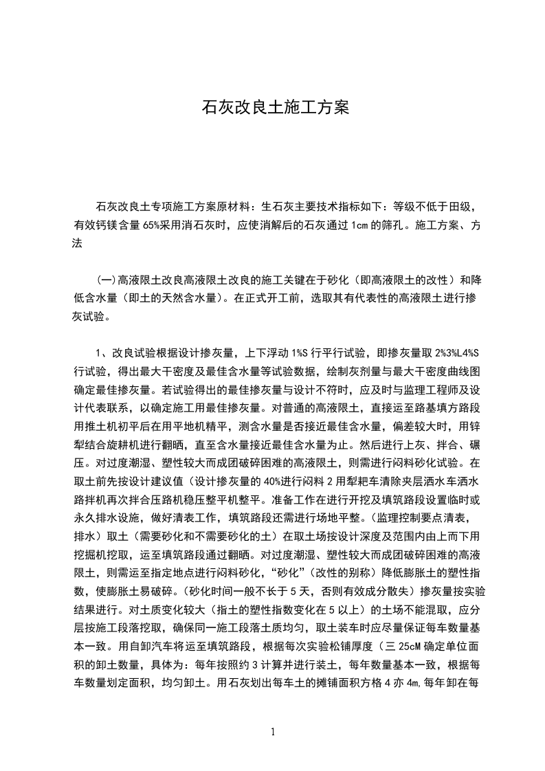 石灰改良土专项施工方案原材料:生石灰主要技术指标如下:等级不低于田级,有效钙镁含量65%采用消石灰时,应使消解后的石灰通过1cm的筛孔。施工方案、方法