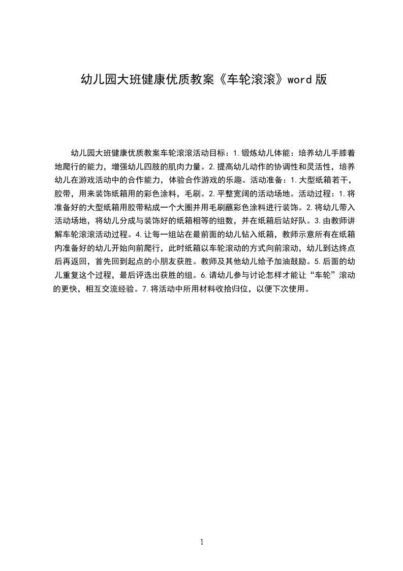三、感受其他物体的滚动1.提问幼儿还有什么物体是滚动的,引出大轮子。2.幼儿与大轮子爸爸和轮子宝宝一起滚动游戏。3.集中交流运动的感受(开心、快乐).