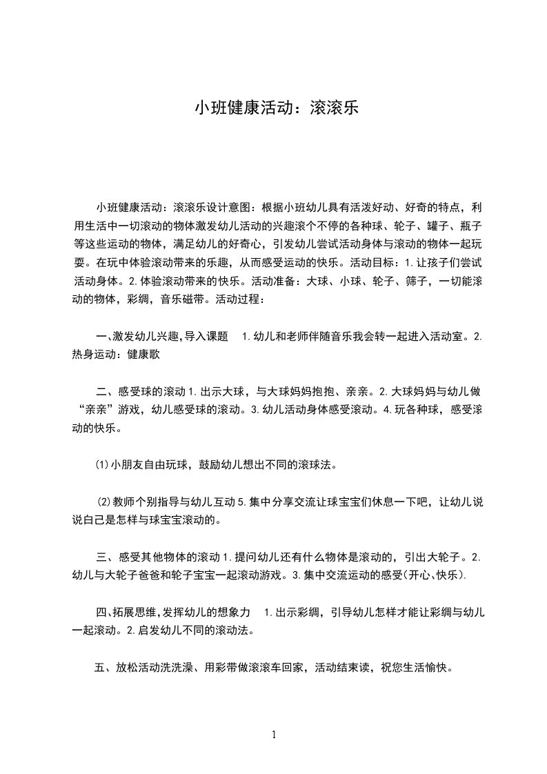 小班健康活动:滚滚乐设计意图:根据小班幼儿具有活泼好动、好奇的特点,利用生活中一切滚动的物体激发幼儿活动的兴趣滚个不停的各种球、轮子、罐子、瓶子等这些运动的物体,满足幼儿的好奇心,引发幼儿尝试活动身体与滚动的物体一起玩耍。在玩中体验滚动带来的乐趣,从而感受运动的快乐。活动目标:1.让孩子们尝试活动身体。2.体验滚动带来的快乐。活动准备:大球、小球、轮子、筛子,一切能滚动的物体,彩绸,音乐磁带。活动过程: