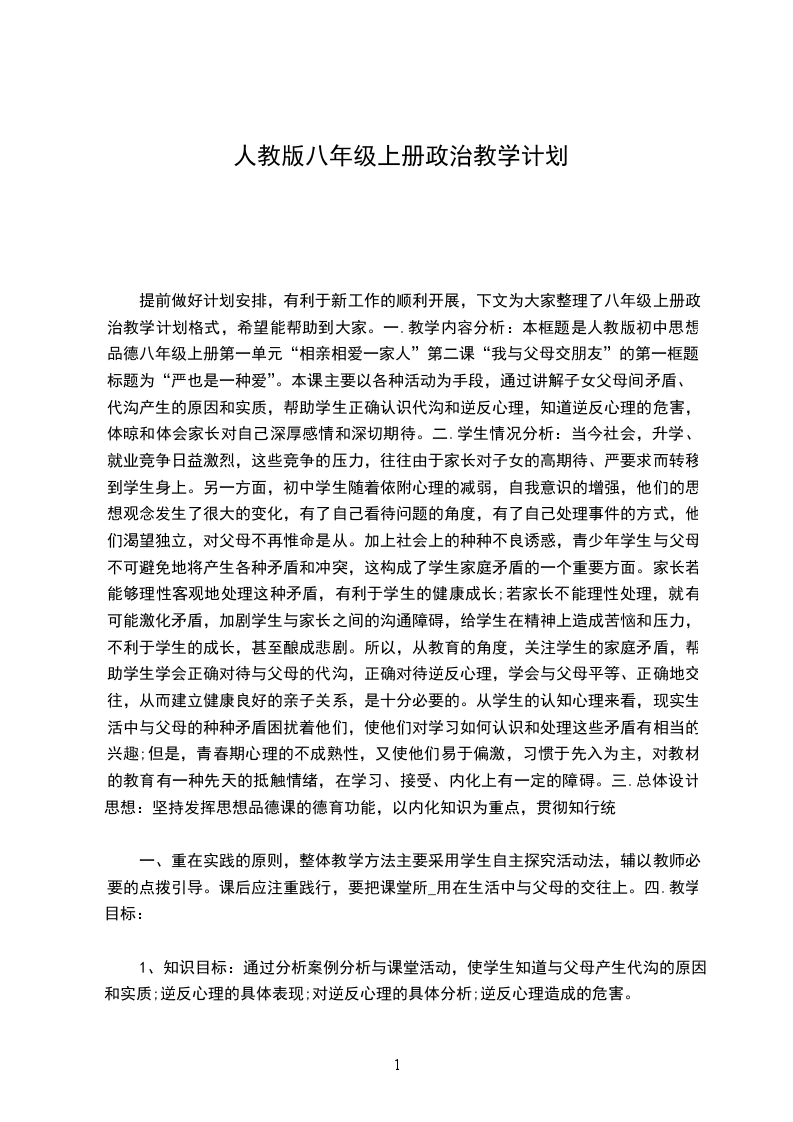 提前做好计划安排,有利于新工作的顺利开展,下文为大家整理了八年级上册政治教学计划格式,希望能帮助到大家。一.教学内容分析:本框题是人教版初中思想品德八年级上册第一单元“相亲相爱一家人”第二课“我与父母交朋友”的第一框题,标题为“严也是一种爱”。本课主要以各种活动为手段,通过讲解子女父母间矛盾、代沟产生的原因和实质,帮助学生正确认识代沟和逆反心理,知道逆反心理的危害,体晾和体会家长对自己深厚感情和深切期待。二.学生情况分析:当今社会,升学、就业竞争日益激烈,这些竞争的压力,往往由于家长对子女的高期待、严要求而转移到学生身上。另一方面,初中学生随着依附心理的减弱,自我意识的增强,他们的思想观念发生了很大的变化,有了自己看待问题的角度,有了自己处理事件的方式,他们渴望独立,对父母不再惟命是从。加上社会上的种种不良诱惑,青少年学生与父母不可避免地将产生各种矛盾和冲突,这构成了学生家庭矛盾的一个重要方面。家长若能够理性客观地处理这种矛盾,有利于学生的健康成长;若家长不能理性处理,就有可能激化矛盾,加剧学生与家长之间的沟通障碍,给学生在精神上造成苦恼和压力,不利于学生的成长,甚至酿成悲剧。所以,从教育的角度,关注学生的家庭矛盾,帮助学生学会正确对待与父母的代沟,正确对待逆反心理,学会与父母平等、正确地交往,从而建立健康良好的亲子关系,是十分必要的。从学生的认知心理来看,现实生活中与父母的种种矛盾困扰着他们,使他们对学习如何认识和处理这些矛盾有相当的兴趣;但是,青春期心理的不成熟性,又使他们易于偏激,习惯于先入为主,对教材的教育有一种先天的抵触情绪,在学习、接受、内化上有一定的障碍。三.总体设计思想:坚持发挥思想品德课的德育功能,以内化知识为重点,贯彻知行统