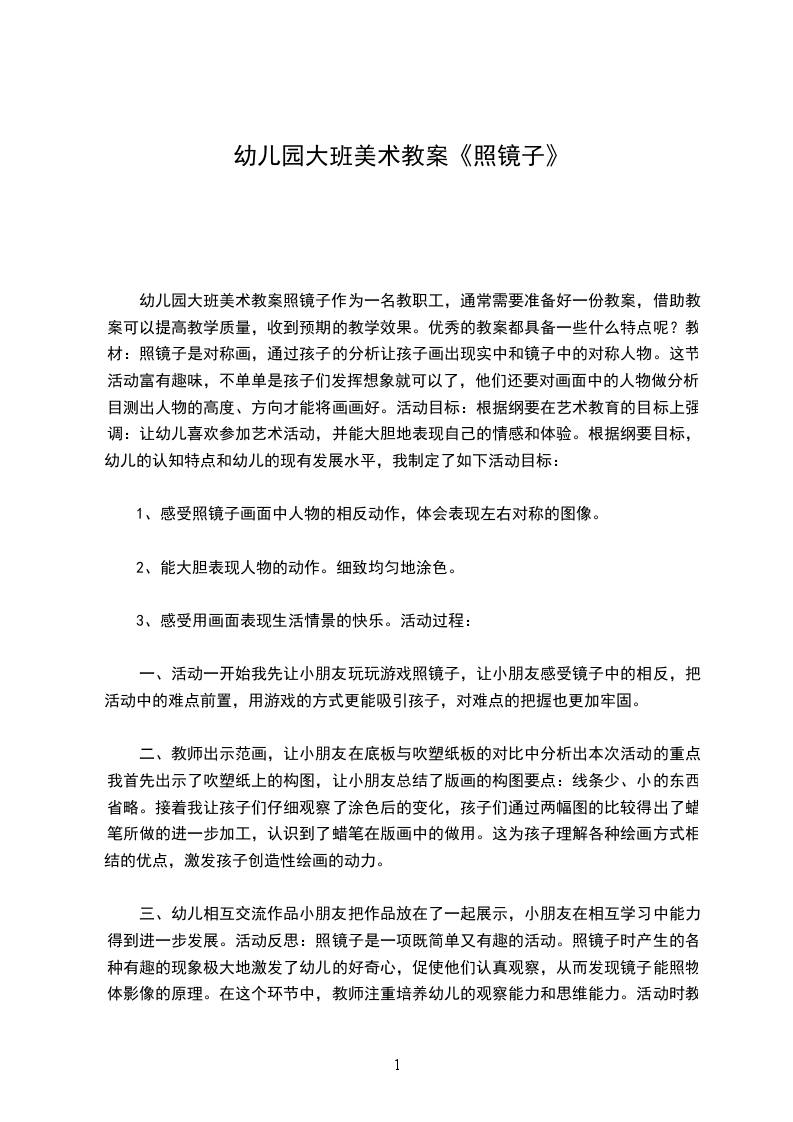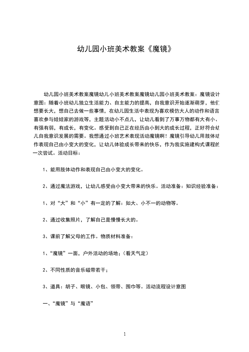 幼儿园小班美术教案魔镜幼儿小班美术教案魔镜幼儿园小班美术教案:魔镜设计意图:随着小班幼儿独立生活能力、自主能力的提高,自我意识开始逐渐萌芽,他们想要长大,想自己去做一些事情,在幼儿园生活中表现为喜欢模仿大人的动作和语言,喜欢参与娃娃家的游戏等,主题活动小不点儿,让幼儿看到了万事万物都有大有小、有强有弱,有成长,有变化。感受到自己正在经历由小到大的成长过程,正好符合幼儿自我意识发展的需要。我想通过小班艺术表现活动魔镜啊!魔镜引导幼儿用肢体动作表现自己由小变大的变化,让幼儿体验成长带来的快乐,作为我实施建构式课程的一次尝试。活动目标: