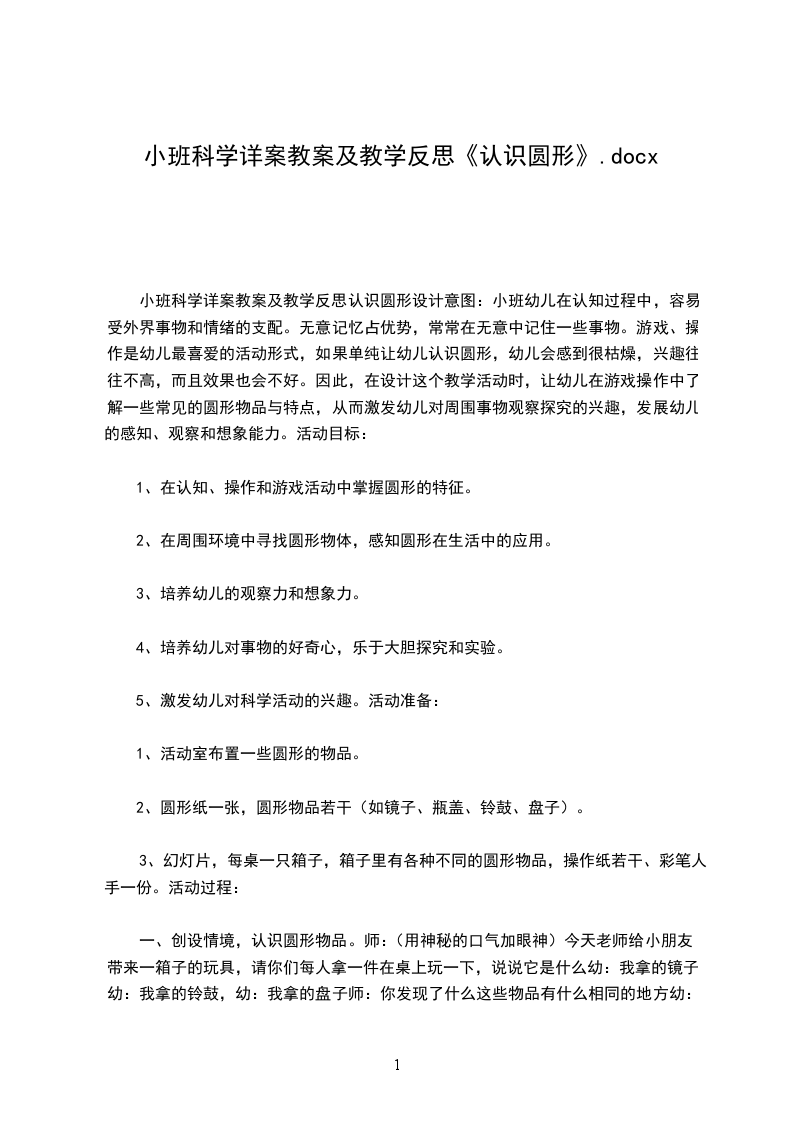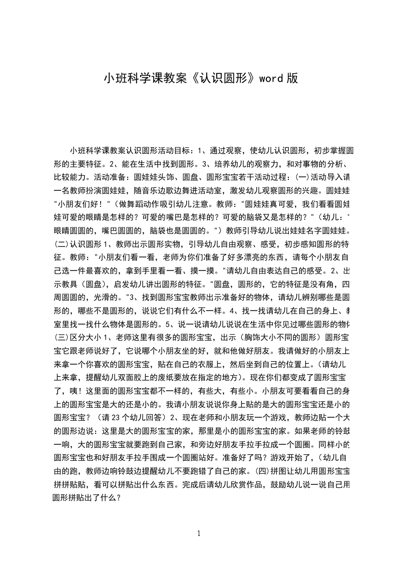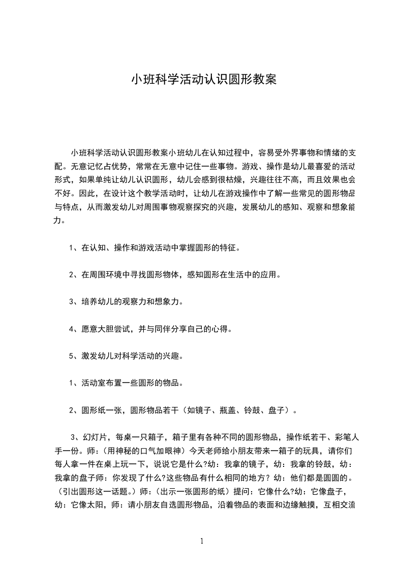 小班科学活动认识圆形教案小班幼儿在认知过程中,容易受外界事物和情绪的支配。无意记忆占优势,常常在无意中记住一些事物。游戏、操作是幼儿最喜爱的活动形式,如果单纯让幼儿认识圆形,幼儿会感到很枯燥,兴趣往往不高,而且效果也会不好。因此,在设计这个教学活动时,让幼儿在游戏操作中了解一些常见的圆形物品与特点,从而激发幼儿对周围事物观察探究的兴趣,发展幼儿的感知、观察和想象能力。