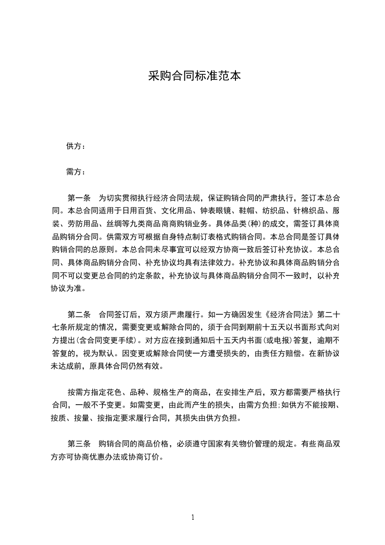 第一条 为切实贯彻执行民法典规,保证购销合同的严肃执行,签订本总合同。本总合同适用于日用百货、文化用品、钟表眼镜、鞋帽、纺织品、针棉织品、服装、劳防用品、丝绸等九类商品商商购销业务。具体品类(种)的成交,需签订具体商品购销分合同。供需双方可根据自身特点制订表格式购销合同。本总合同是签订具体购销合同的总原则。本总合同未尽事宜可以经双方协商一致后签订补充协议。本总合同、具体商品购销分合同、补充协议均具有法律效力。补充协议和具体商品购销分合同不可以变更总合同的约定条款,补充协议与具体商品购销分合同不一致时,以补充协议为准。