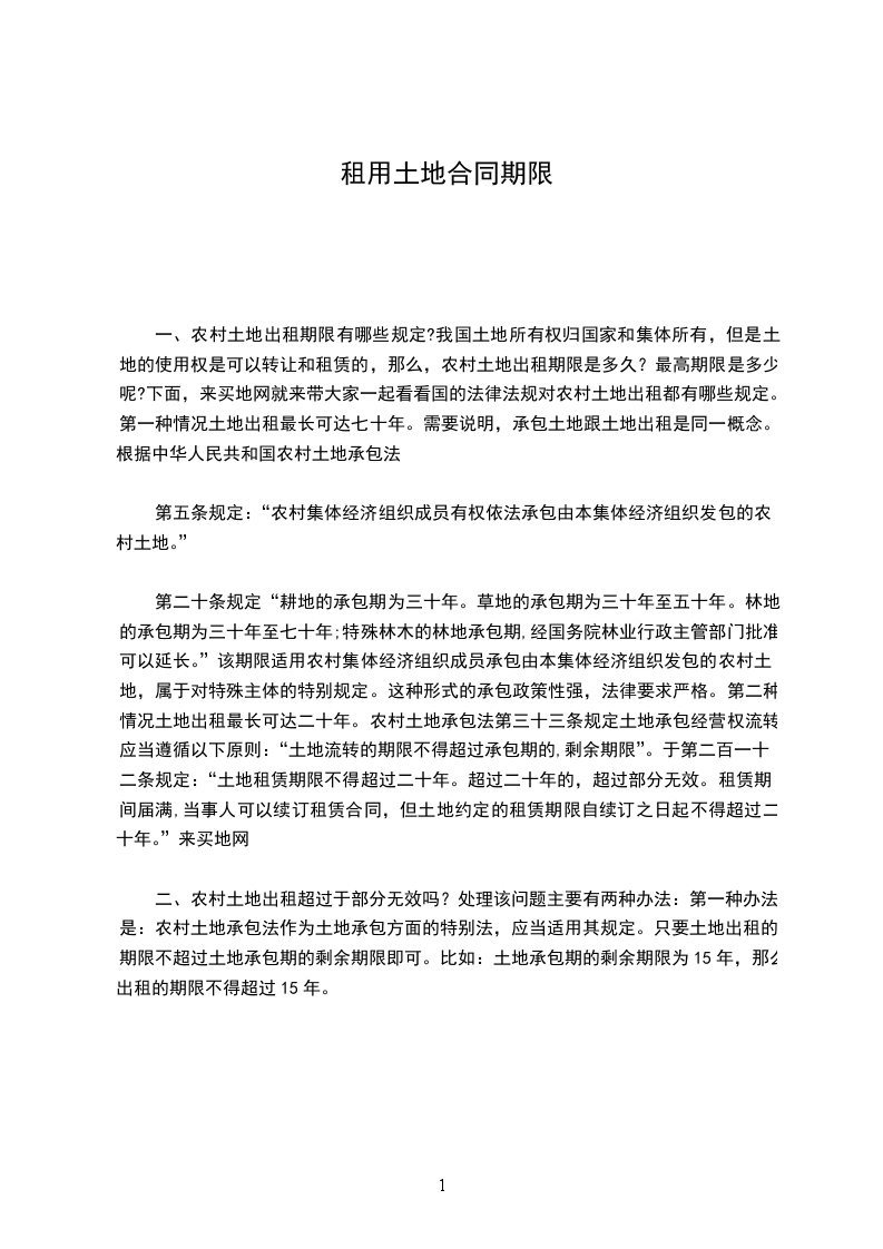 第二十条规定“耕地的承包期为三十年。草地的承包期为三十年至五十年。林地的承包期为三十年至七十年;特殊林木的林地承包期,经国务院林业行政主管部门批准可以延长。”该期限适用农村集体经济组织成员承包由本集体经济组织发包的农村土地,属于对特殊主体的特别规定。这种形式的承包政策性强,法律要求严格。第二种情况土地出租最长可达二十年。农村土地承包法第三十三条规定土地承包经营权流转应当遵循以下原则:“土地流转的期限不得超过承包期的,剩余期限”。于第二百一十二条规定:“土地租赁期限不得超过二十年。超过二十年的,超过部分无效。租赁期间届满,当事人可以续订租赁合同,但土地约定的租赁期限自续订之日起不得超过二十年。”来买地网
