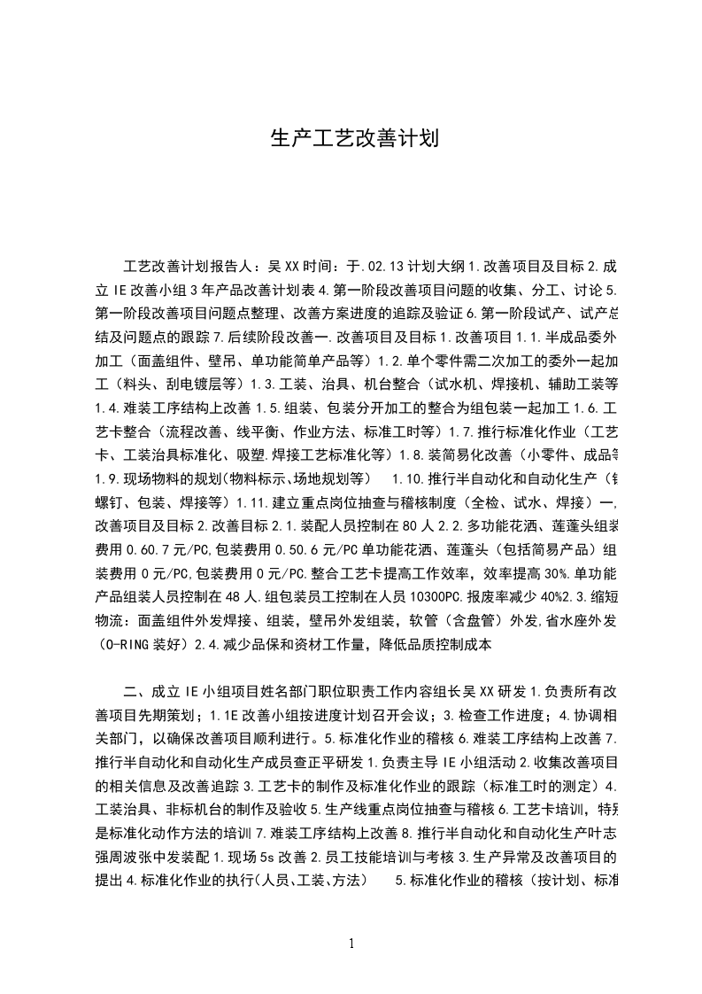 工艺改善计划报告人:吴XX时间:于.02.13计划大纲1.改善项目及目标2.成立IE改善小组3年产品改善计划表4.第一阶段改善项目问题的收集、分工、讨论5.第一阶段改善项目问题点整理、改善方案进度的追踪及验证6.第一阶段试产、试产总结及问题点的跟踪7.后续阶段改善一.改善项目及目标1.改善项目1.1.半成品委外加工(面盖组件、壁吊、单功能简单产品等)1.2.单个零件需二次加工的委外一起加工(料头、刮电镀层等)1.3.工装、治具、机台整合(试水机、焊接机、辅助工装等)1.4.难装工序结构上改善1.5.组装、包装分开加工的整合为组包装一起加工1.6.工艺卡整合(流程改善、线平衡、作业方法、标准工时等)1.7.推行标准化作业(工艺卡、工装治具标准化、吸塑.焊接工艺标准化等)1.8.装简易化改善(小零件、成品等)1.9.现场物料的规划(物料标示、场地规划等)1.10.推行半自动化和自动化生产(锁螺钉、包装、焊接等)1.11.建立重点岗位抽查与稽核制度(全检、试水、焊接)一,改善项目及目标2.改善目标2.1.装配人员控制在80人2.2.多功能花洒、莲蓬头组装费用0.60.7元/PC,包装费用0.50.6元/PC单功能花洒、莲蓬头(包括简易产品)组装费用0元/PC,包装费用0元/PC.整合工艺卡提高工作效率,效率提高30%.单功能产品组装人员控制在48人.组包装员工控制在人员10300PC.报废率减少40%2.3.缩短物流:面盖组件外发焊接、组装,壁吊外发组装,软管(含盘管)外发,省水座外发(O-RING装好)2.4.减少品保和资材工作量,降低品质控制成本
